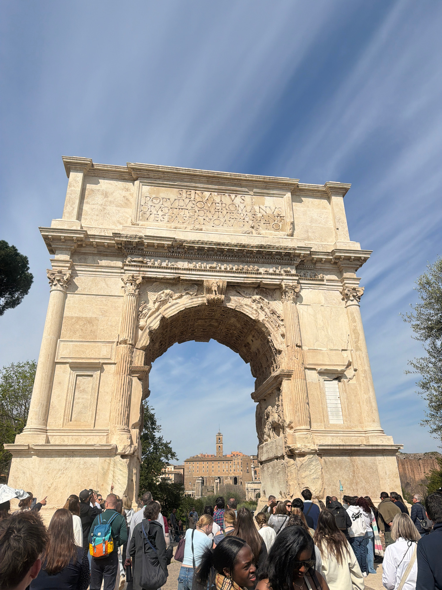 The image depicts the Arch of Titus in Rome, Italy. This ancient Roman arch stands as a monument to Emperor Titus's victory. The arch, constructed from white marble, is prominently featured against a partly cloudy blue sky. The sky has striations of clouds. A crowd of people is gathered around the arch, observing and taking pictures. In the distance, through the archway, buildings are visible. The overall lighting suggests it is daytime. | Open Wire
