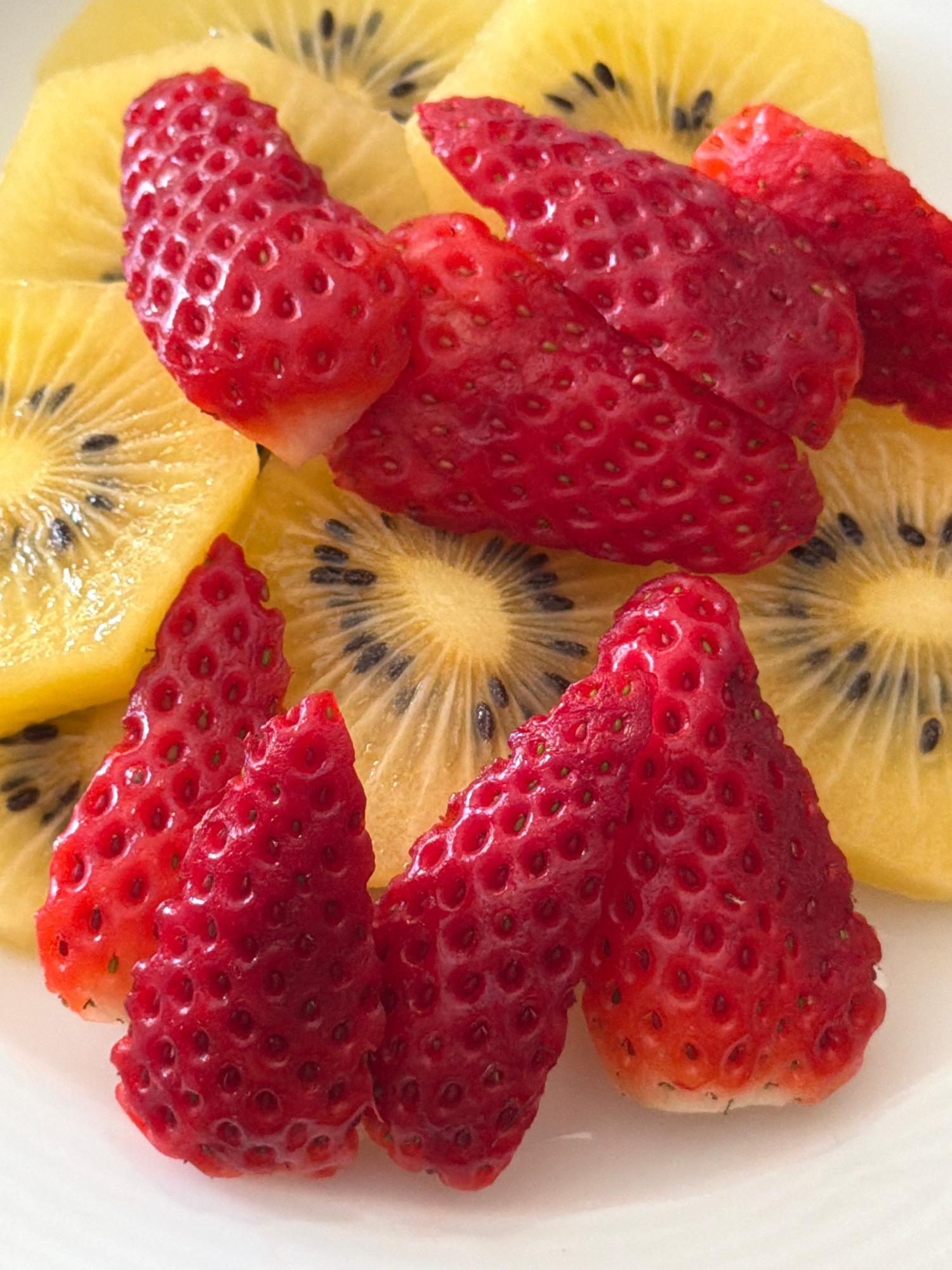 A close-up, overhead shot shows sliced strawberries and yellow kiwi fruit on a white surface. The red strawberry pieces are unevenly cut and scattered among the golden kiwi slices, which are circular…read more