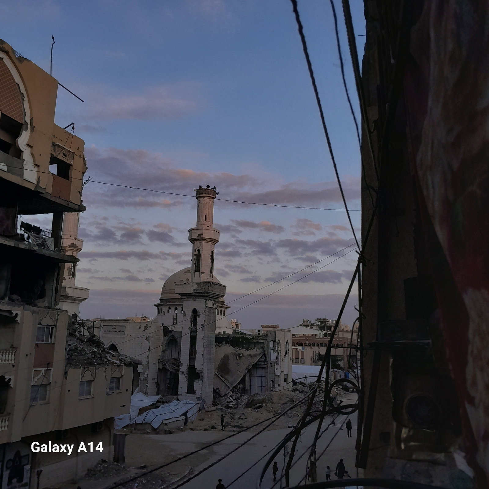 The image depicts a scene of devastation, likely in Khan Yunis, Palestinian Territory, as evidenced by the architectural style of the buildings and the presence of a minaret. The foreground is dominat…read more