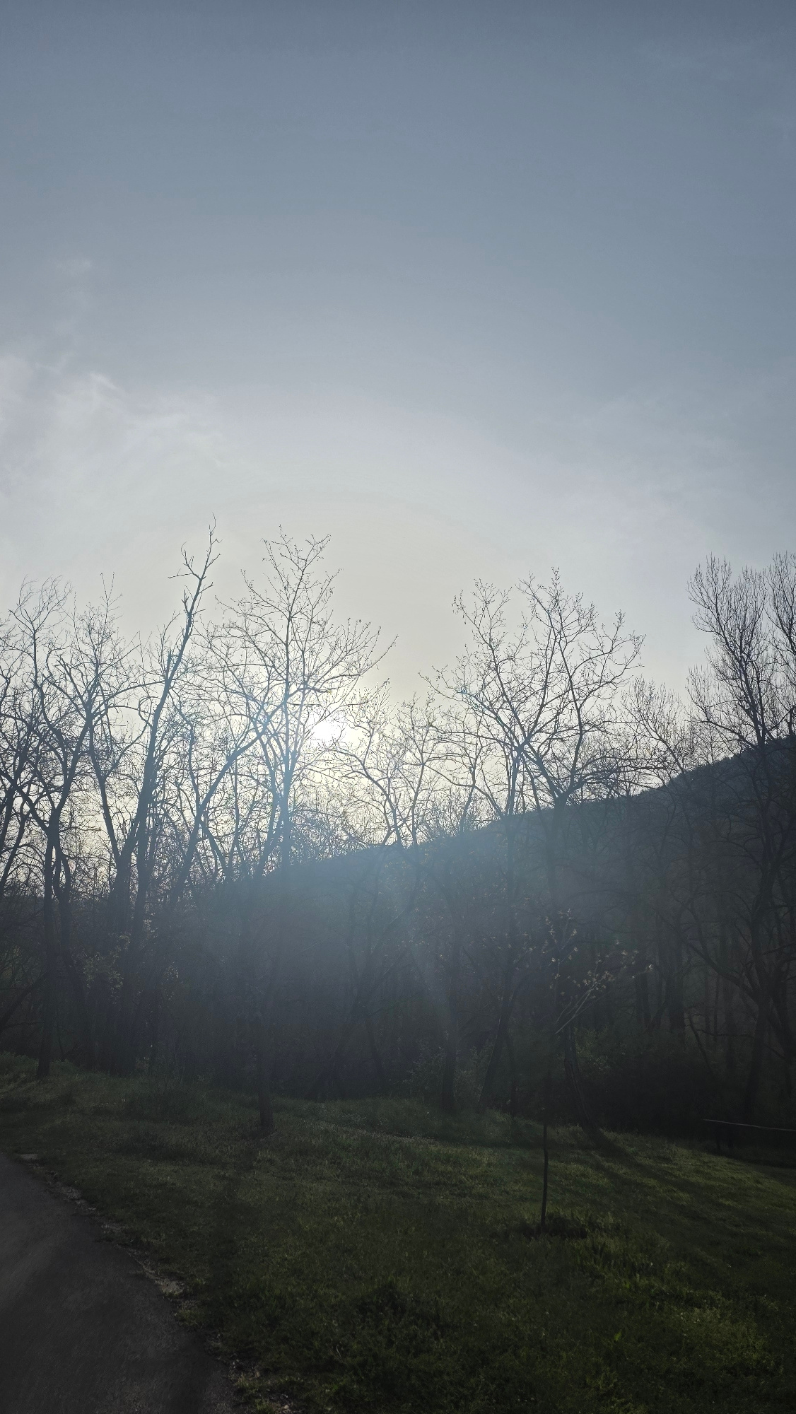 The image presents a view angled upwards towards a cloudy sky. Silhouetted tree branches are prominent in the foreground and midground, partially obscuring the light. A patch of green grass is visible…read more