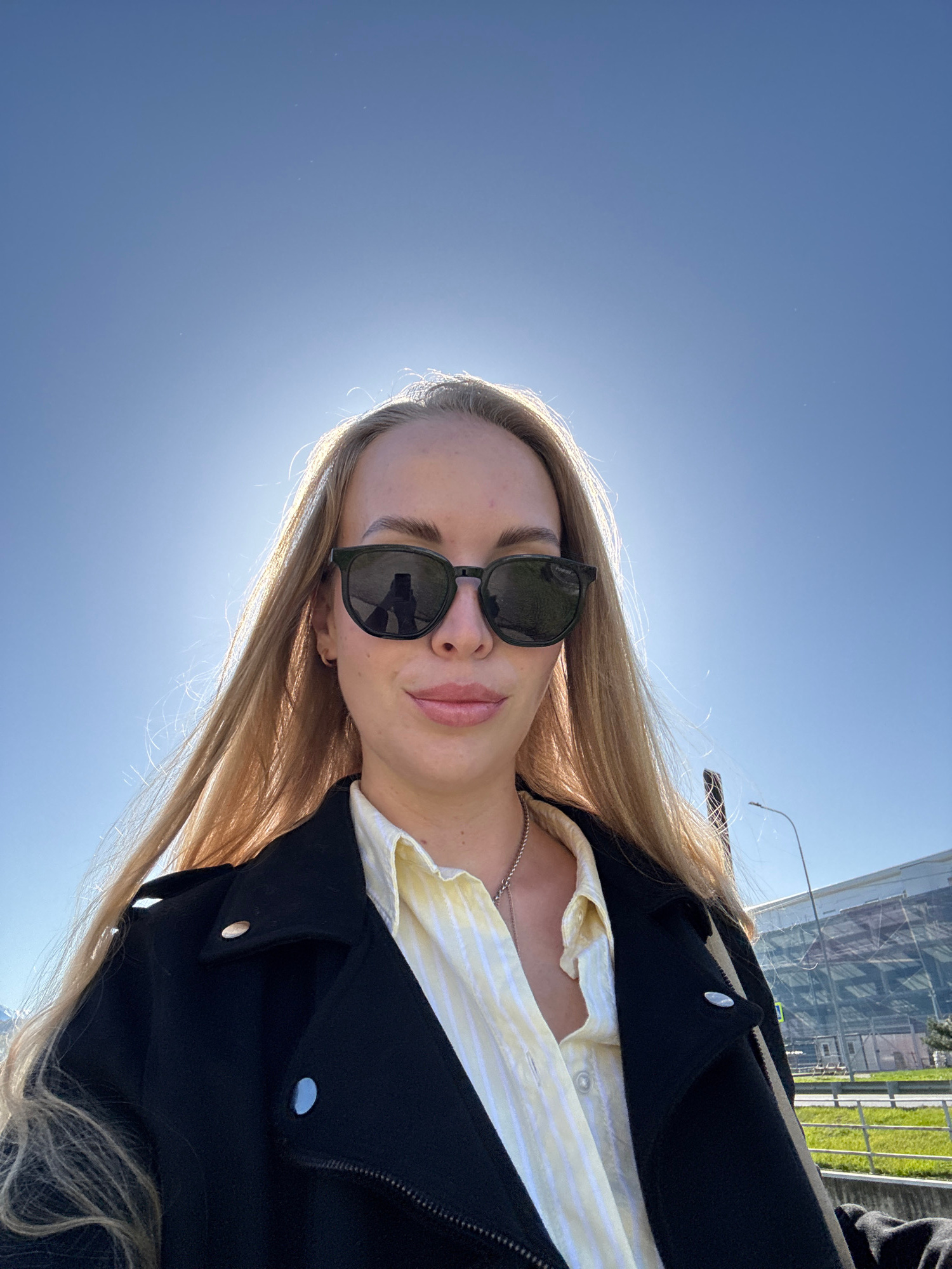 A bright, sunlit outdoor portrait captures a young woman from a low, upward-looking angle, with the image oriented 90 degrees clockwise. She occupies the left and bottom portions of the frame, looking…read more
