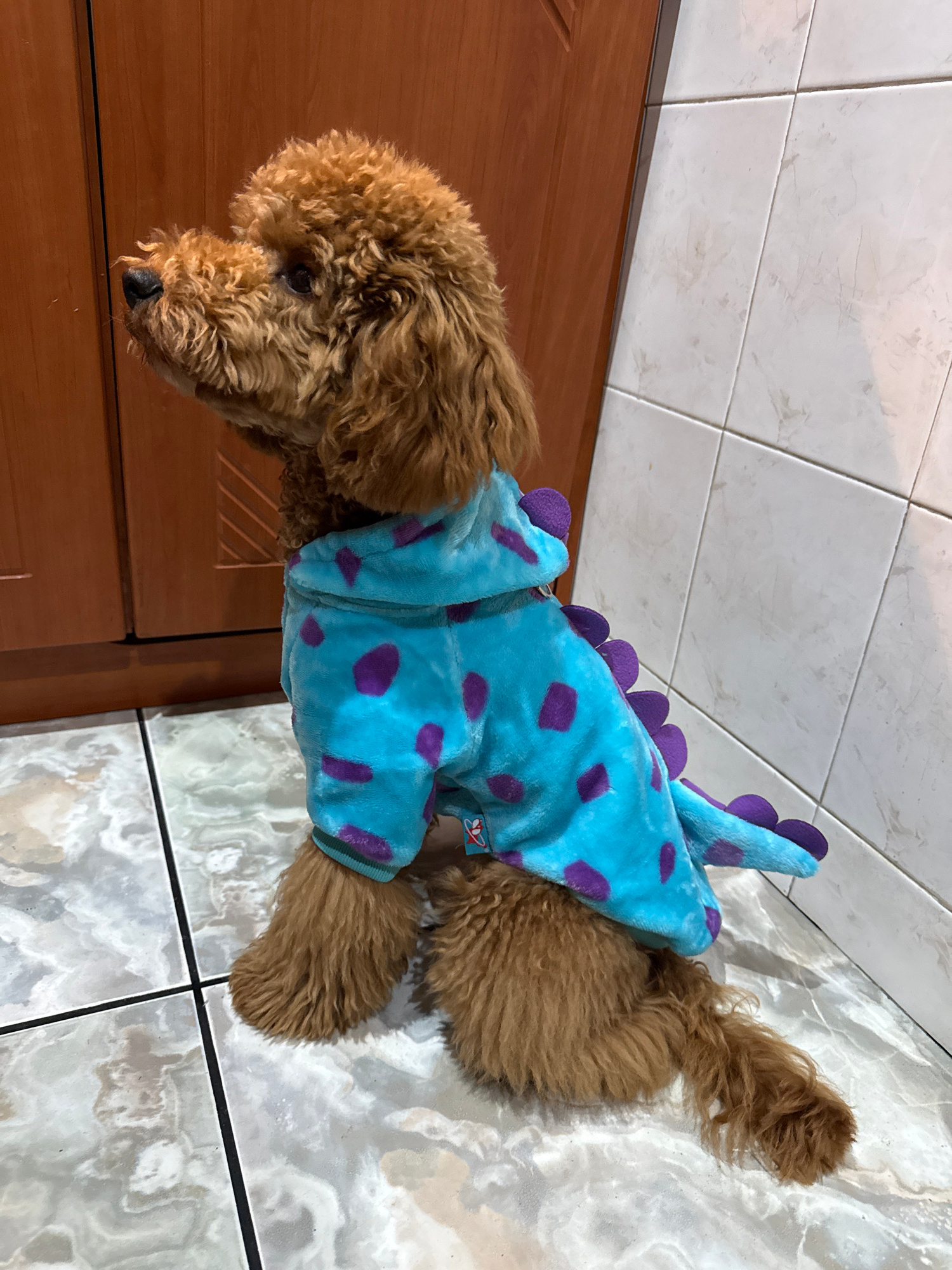 A brown poodle is lying on a light-colored tiled floor next to a wooden cabinet or door. The poodle is wearing a light blue costume with purple polka dots and purple spikes along the back. The locatio…read more