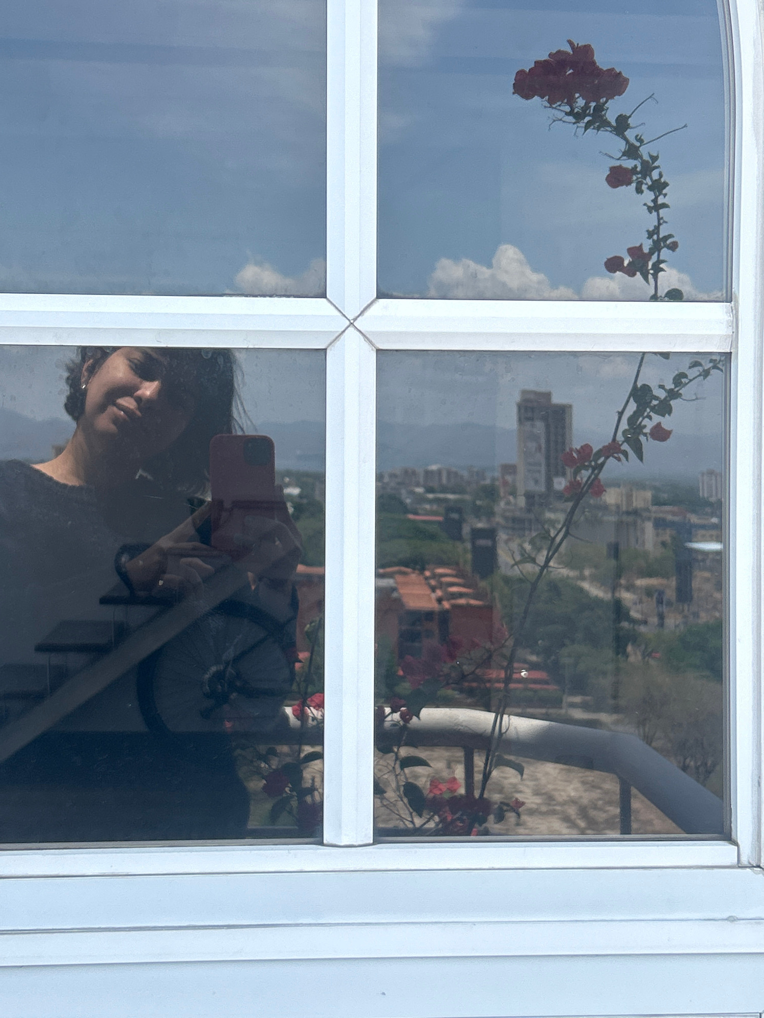 The image displays a complex reflection captured through a four-pane window with a white frame. The overall impression is a layered view of both indoor and outdoor elements under bright daylight. Inβ¦read more