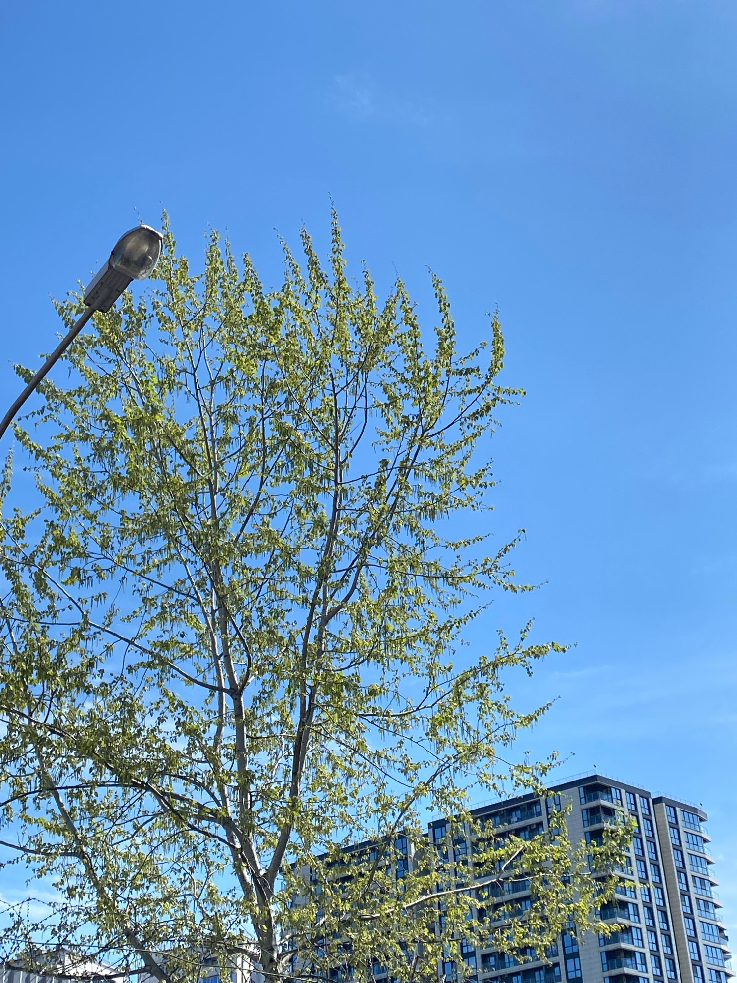 A low-angle shot shows a street lamp and tree branches with new leaves against a blue sky. A tall building is partially visible on the right. There is no evidence of the location being in Sochi, Russi…read more
