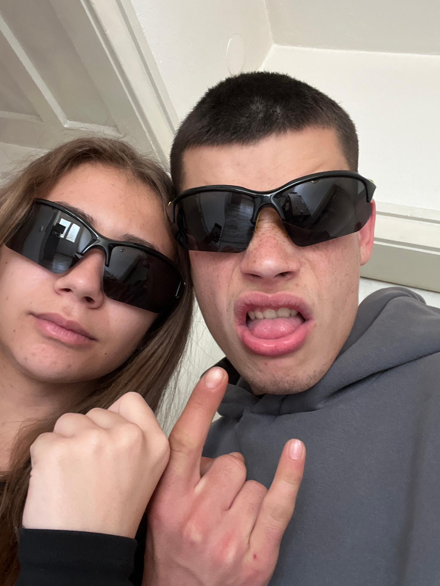 The image depicts two individuals wearing sunglasses, one male and one female, indoors. The male is positioned above the female, with a gray hooded sweatshirt visible. His mouth is open, exposing his…read more