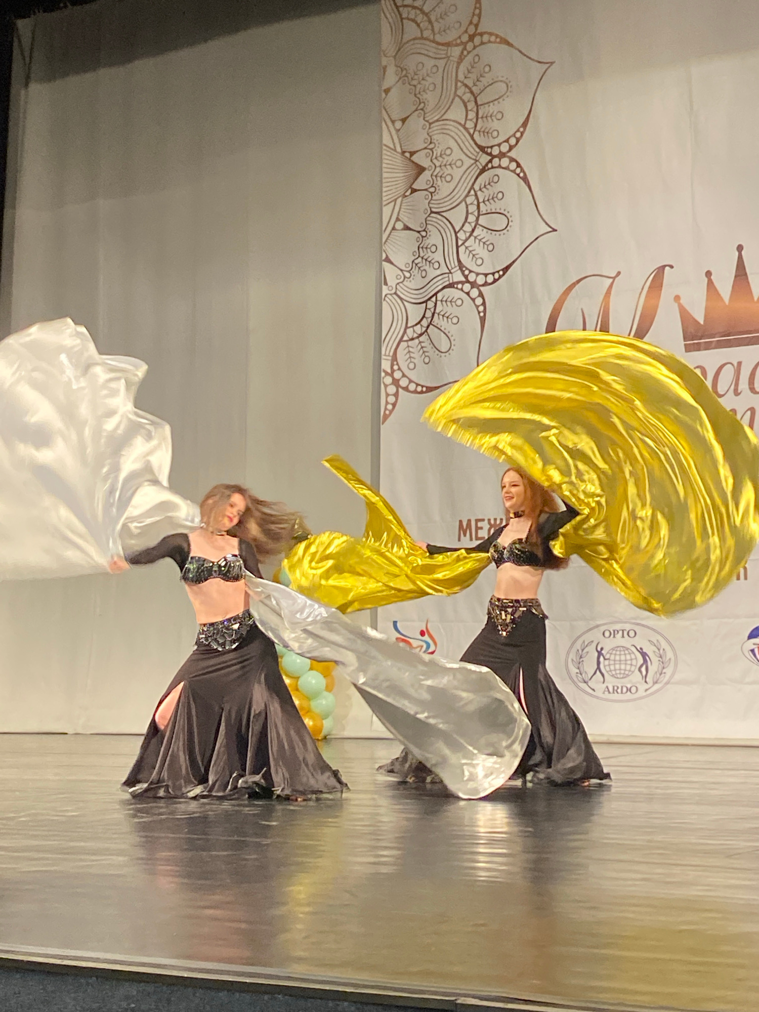 Two women are performing belly dancing on a stage. The woman on the left is holding a large white silk veil, while the woman on the right is holding a large gold silk veil. Both women are wearing blacβ¦read more