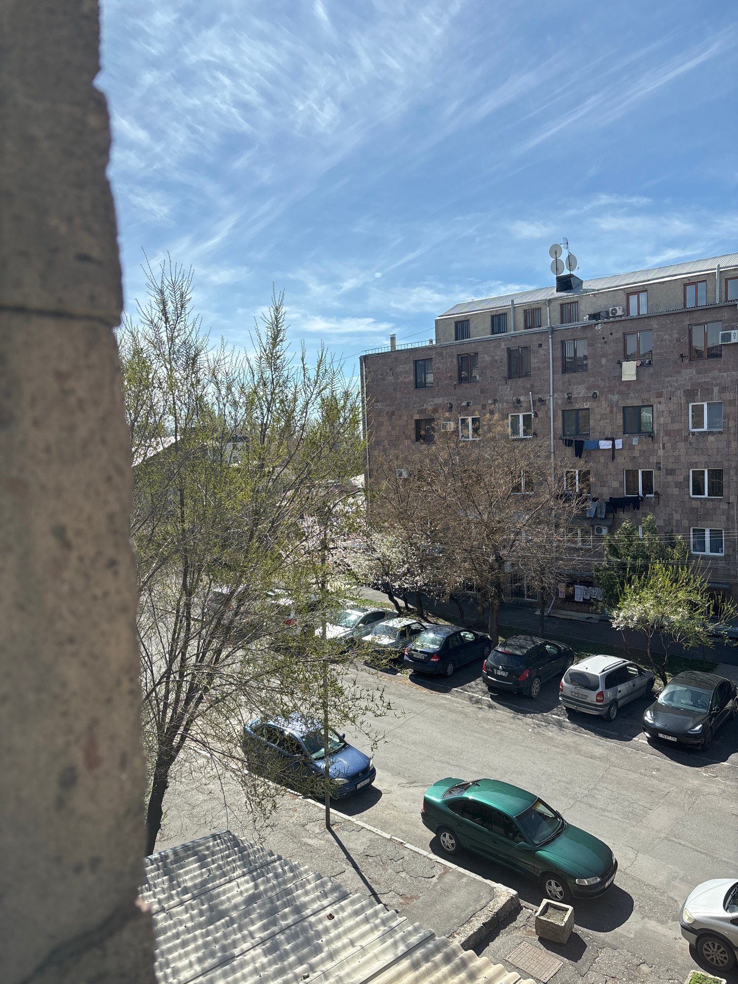 A medium-angle shot shows a parking area in Yerevan, Armenia, viewed from above. A gray concrete ledge occupies the foreground. In the background, a multi-story building constructed of tan brick stand…read more