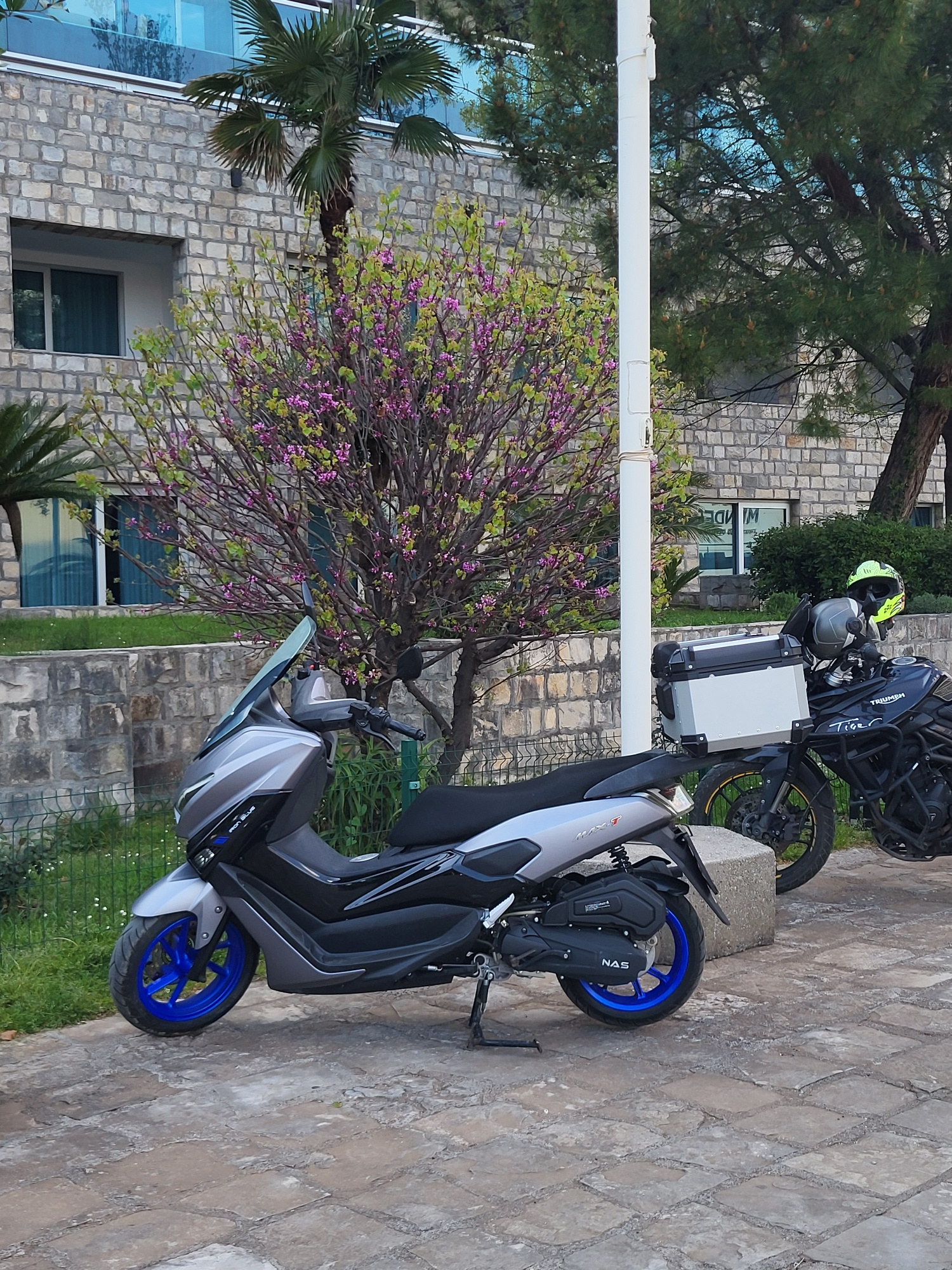 The image shows two motorcycles parked on a stone-paved area in Budva, Montenegro. One is a black and silver scooter with blue wheels, partially obscuring the second motorcycle, a black Triumph advent…read more