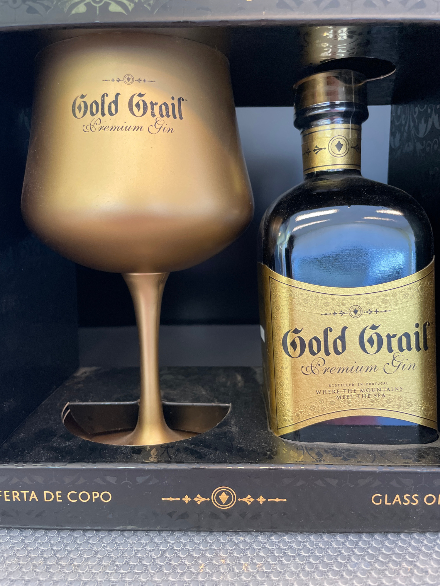 A close-up, overhead view captures a gift set featuring a bottle of gin and a gold-colored glass, presented within a dark, ornate box. The items are neatly nestled in custom-fitted compartments. Theβ¦read more