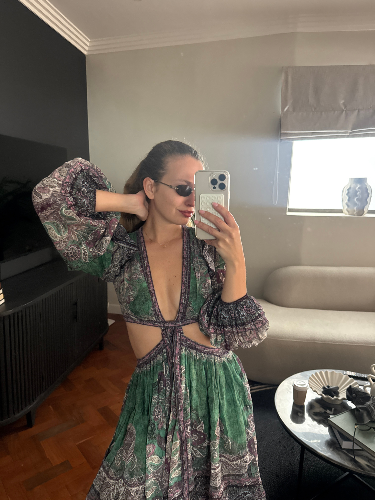 A woman is taking a selfie in a room. She is wearing sunglasses and a green and purple patterned dress with cutouts at the waist. She is holding a smartphone in her right hand, presumably to capture t…read more