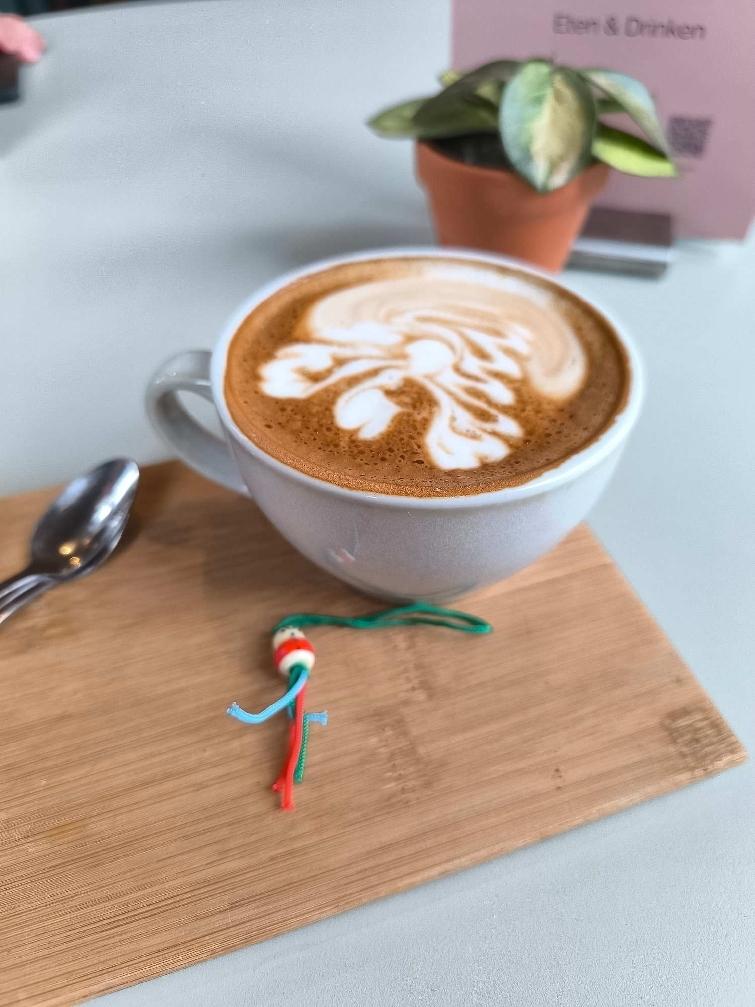 A close-up photograph shows a white ceramic mug filled with a latte, featuring latte art on top. The mug rests on a light brown, wooden serving board, next to a metal spoon. A small, beaded charm withβ¦read more