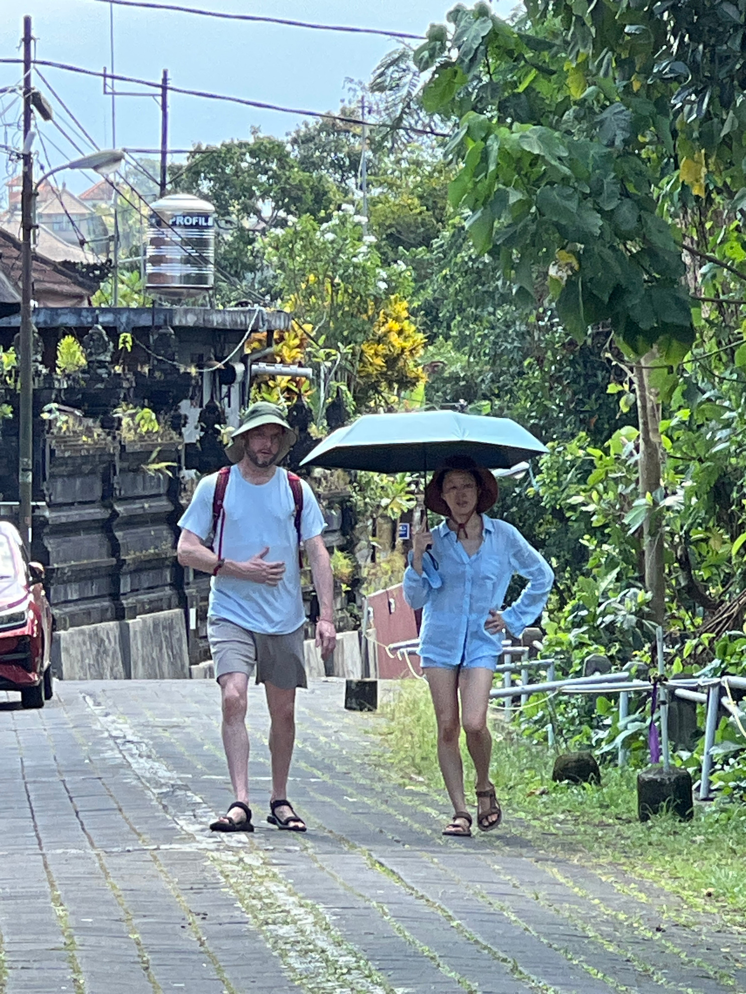 Two people, a man and a woman, are standing on a paved brick pathway in the Ubud District, Indonesia. The man is wearing a light blue t-shirt, khaki shorts, a light-colored hat, sandals, and a red bac…read more