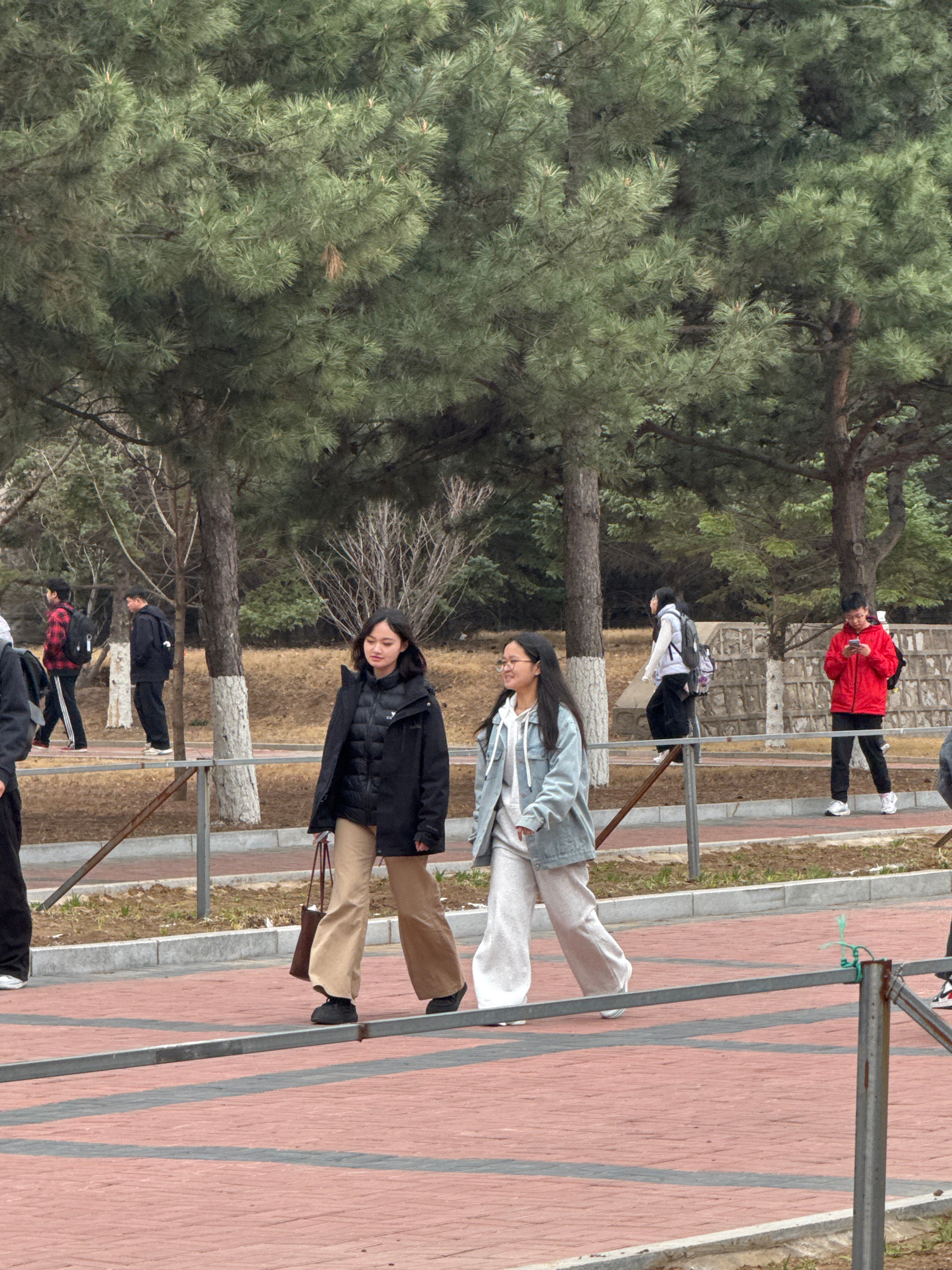The image shows a group of people walking on a brick-paved walkway in an outdoor area, likely a park. There are trees to the left, with dense green foliage. A metal railing runs along the walkway. Sev…read more