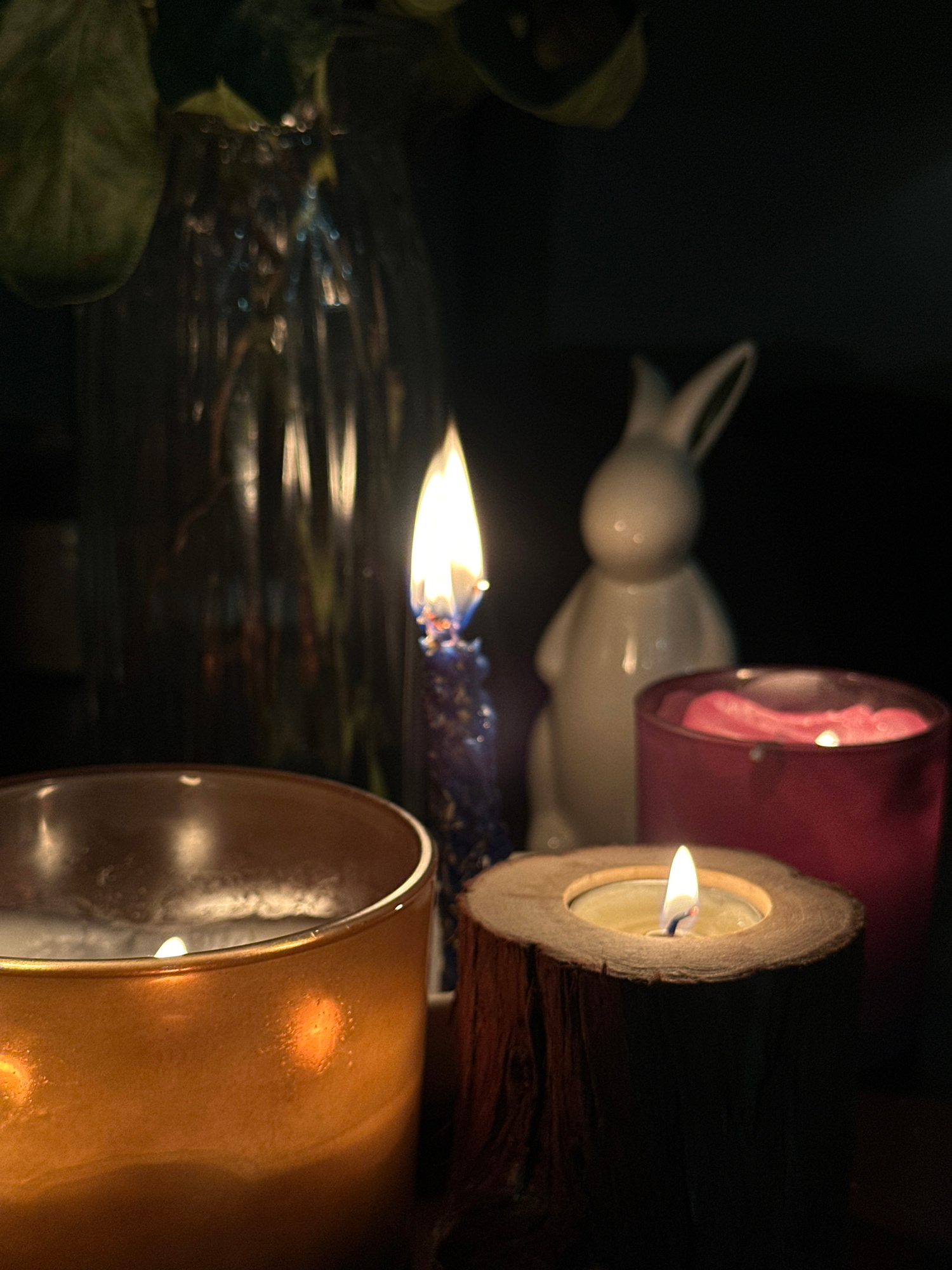 The image shows a dimly lit indoor scene featuring several decorative elements. Two lit candles are prominent, one in a wooden holder and another in a golden container. A pink cylindrical object is pa…read more