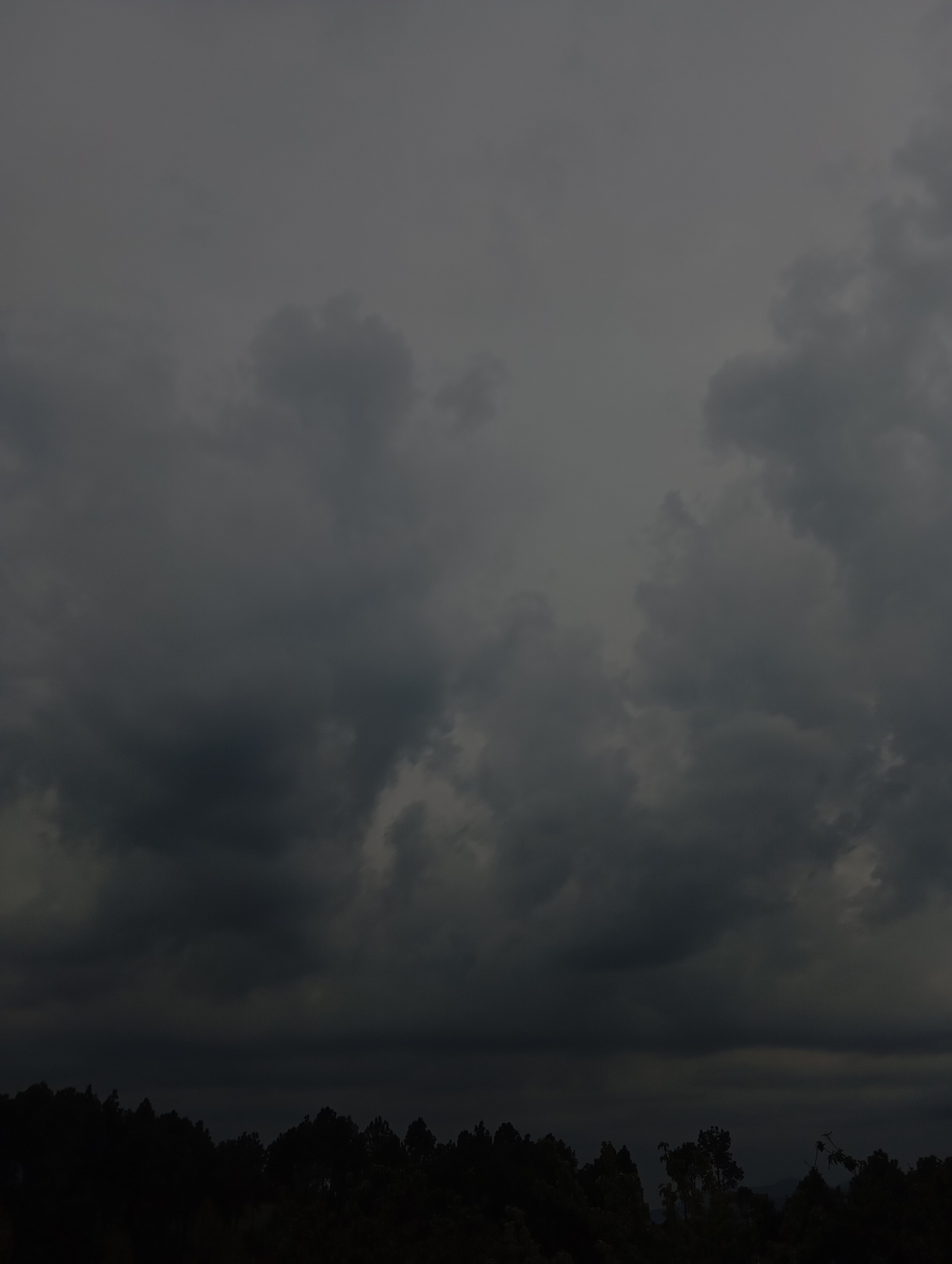 The image shows a stormy sky over Lassan, Pakistan. Dark, heavy clouds fill most of the frame, suggesting an impending or ongoing storm. At the bottom of the image, the silhouette of trees is visible,…read more