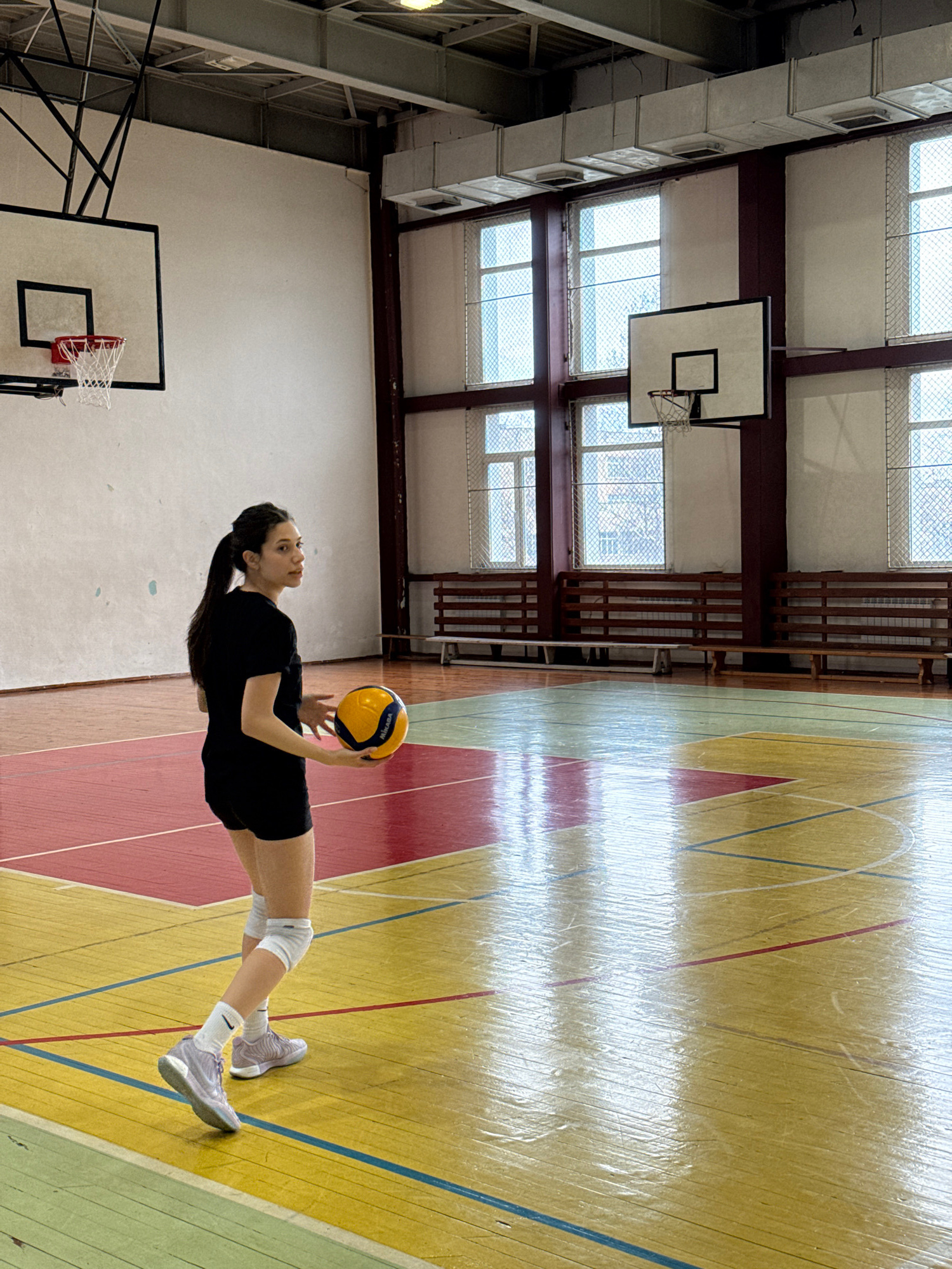 A young woman in a black t-shirt and black shorts stands on a gymnasium floor holding a yellow and blue volleyball. She is wearing white athletic shoes and knee pads. The gymnasium has a wooden floor…read more