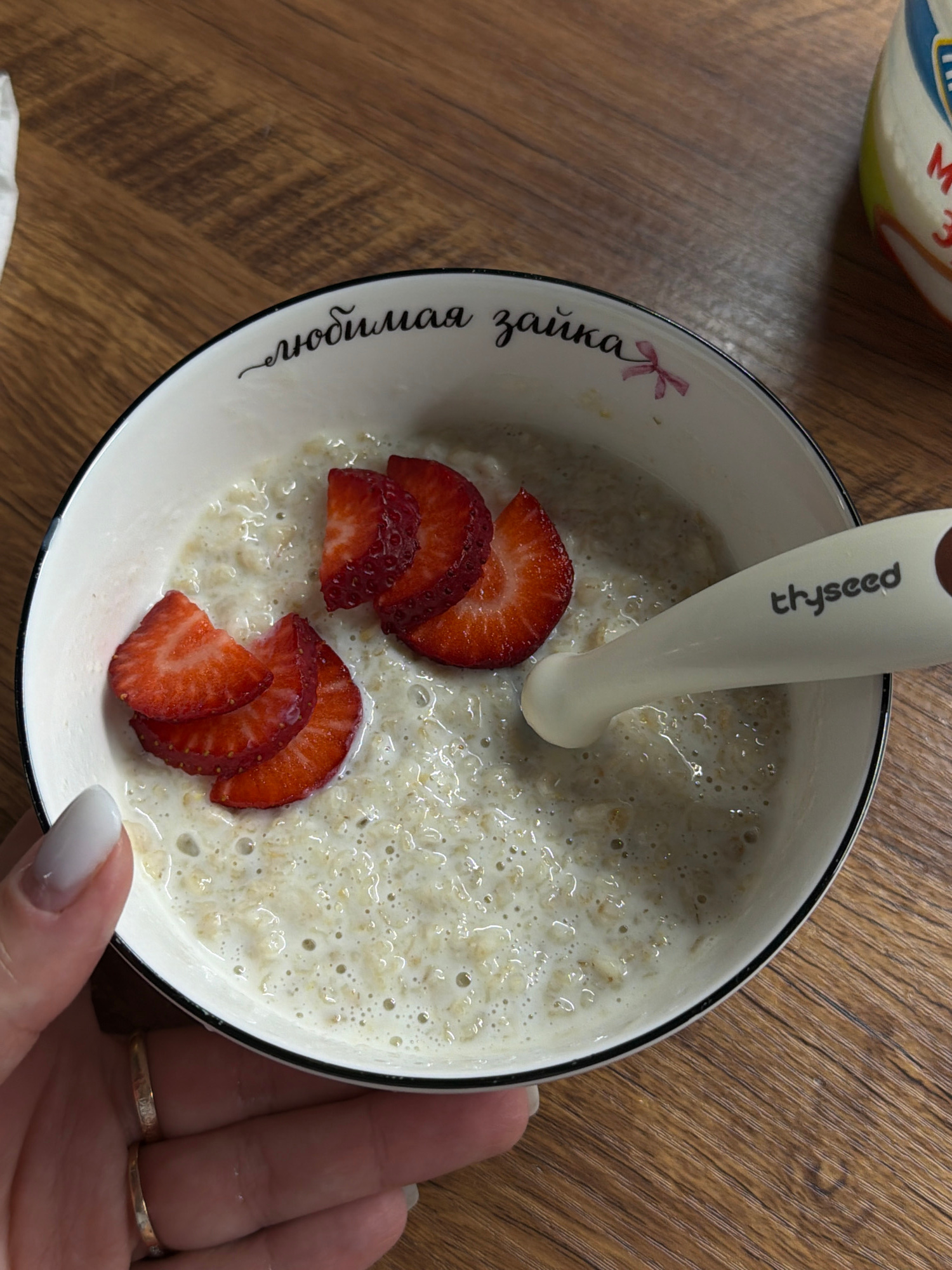 A high-angle, close-up shot features a bowl of oatmeal with sliced strawberries on a wooden surface. A white spoon with the word "thyseed" imprinted on it rests in the oatmeal. The bowl is white with…read more