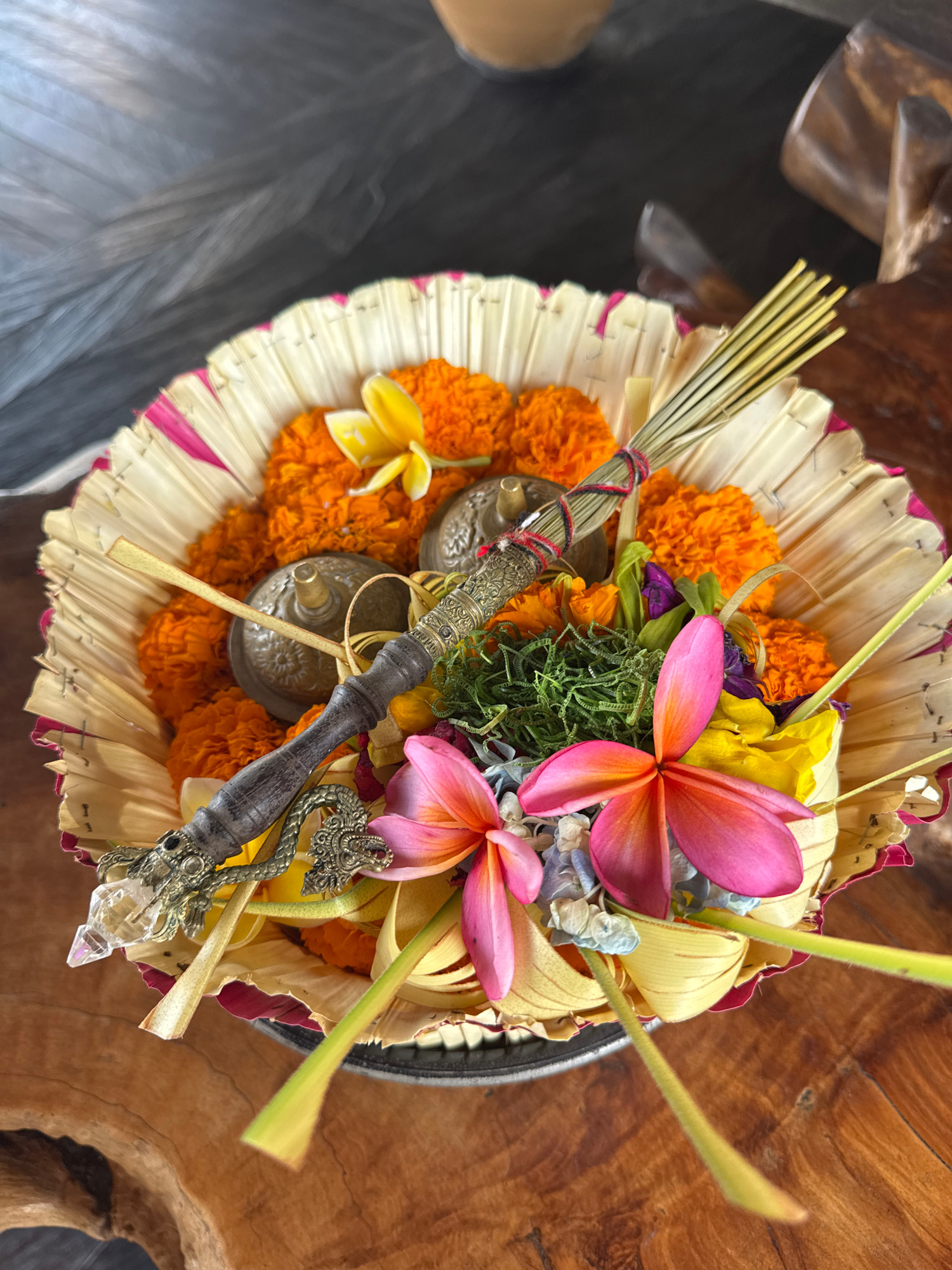 The image depicts a Balinese Hindu offering, known as a Canang Sari, placed on a wooden surface, likely in Payangan, Indonesia. The offering is arranged in a round woven basket base, decorated with me…read more