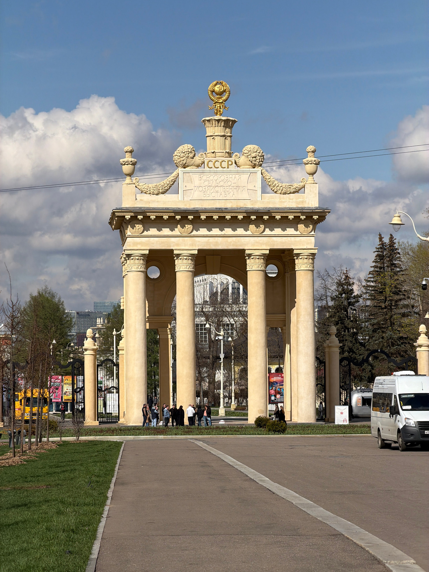 The image captures a grand, ornate architectural entrance gate or archway, characteristic of Soviet-era design. The structure is constructed from light-colored stone or concrete, featuring multiple ta…read more