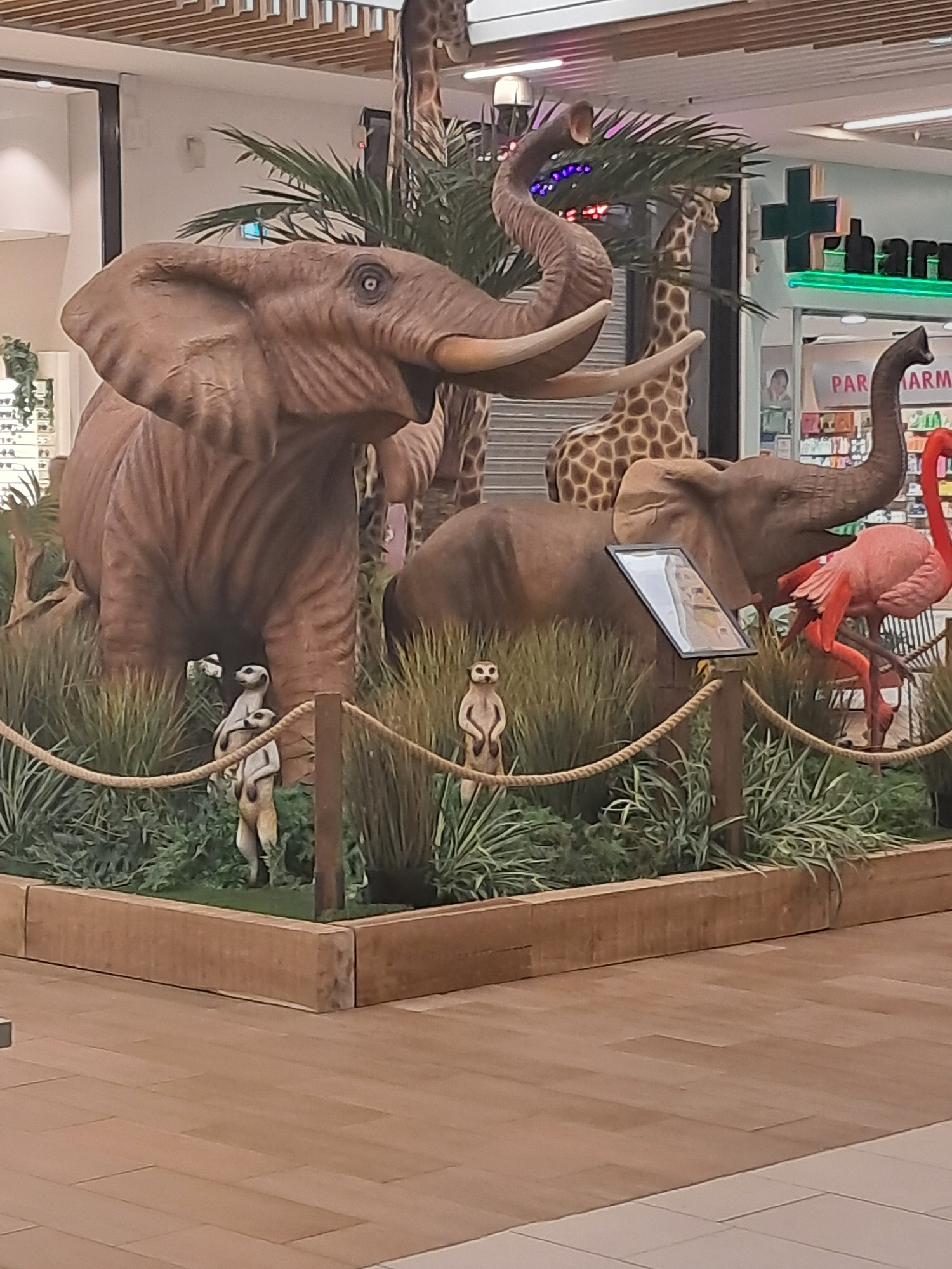 The image shows a diorama of African animals displayed indoors, likely in a commercial or public space. Prominent are two large elephant statues with raised trunks, a giraffe statue, and a pink flamin…read more
