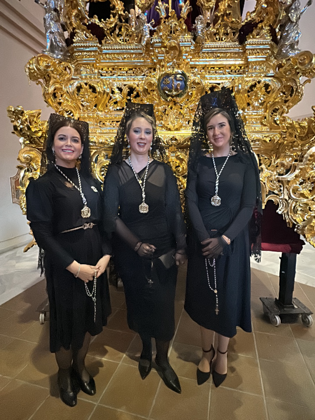 Three women stand in front of a large, ornate, gold-colored religious float inside a building, likely a church, in Jerez de la Frontera, Spain. All three women are wearing black dresses and black lace…read more