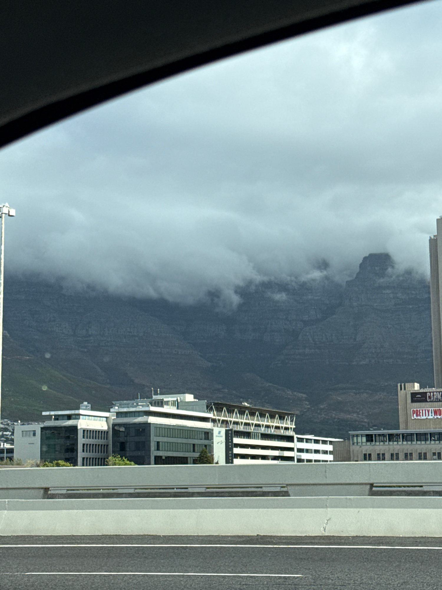 The image shows Table Mountain in Cape Town, South Africa, partially obscured by clouds. To the right are buildings including one advertising "PRETTY WOM". The view appears to be from inside a vehicle…read more