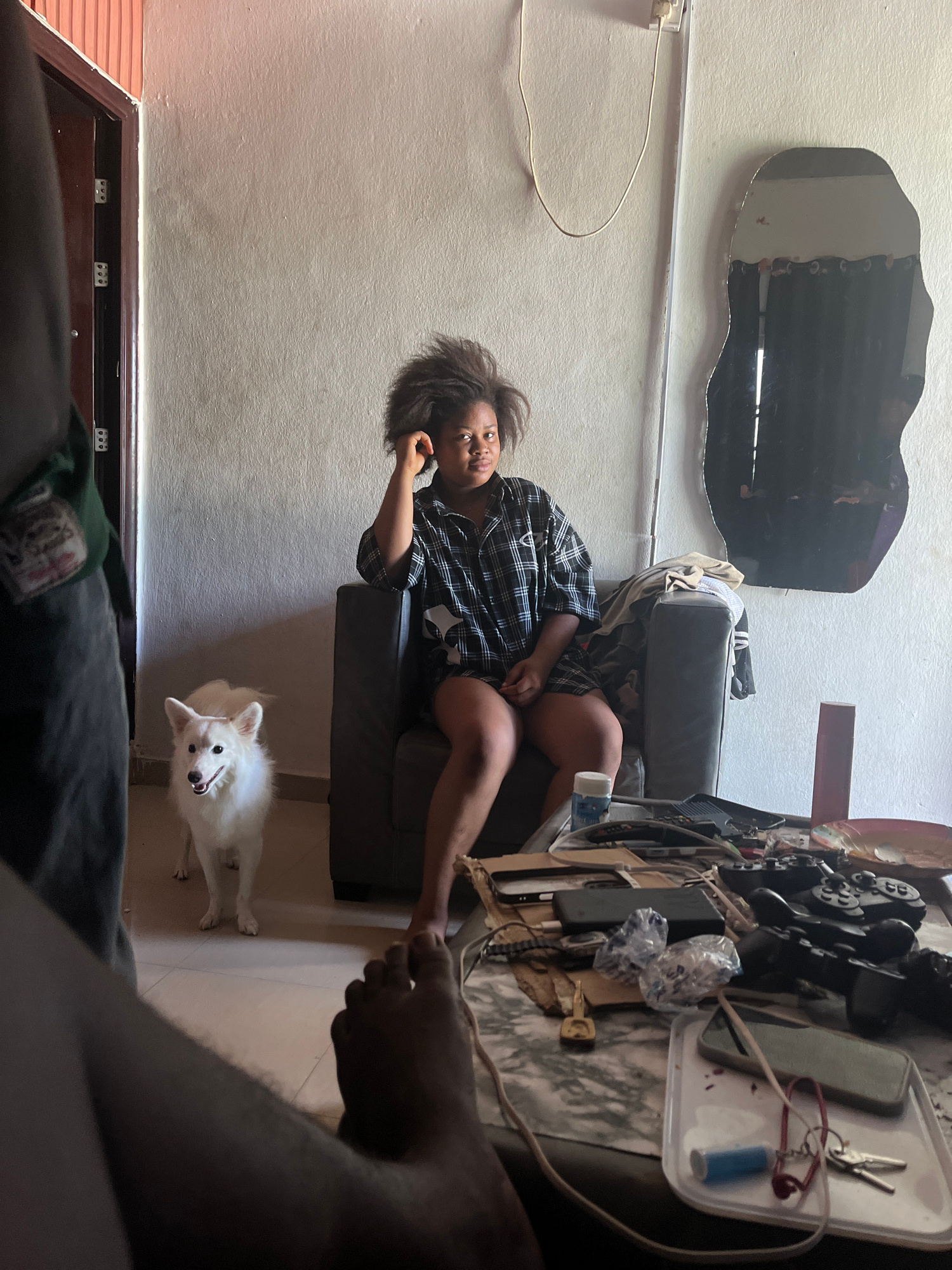 An interior scene featuring a woman seated on a gray armchair positioned against a white wall, with an irregularly shaped mirror above. The woman has dark hair and wears a patterned black and white sh…read more