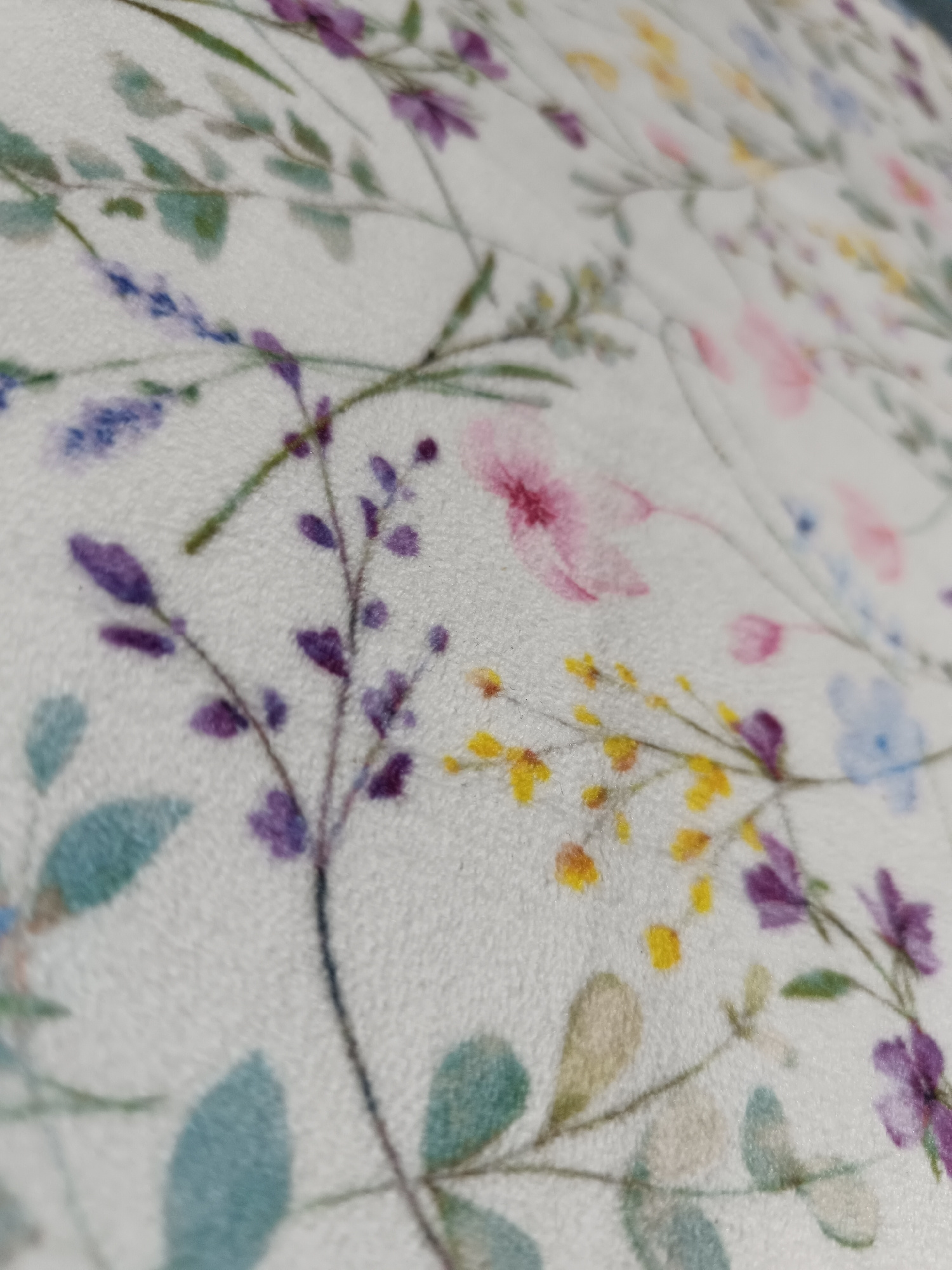 The image shows a close-up of a floral-patterned soft fabric, likely a blanket or similar textile. The background color is white with an array of painted-style flowers and leaves in various colors, in…read more