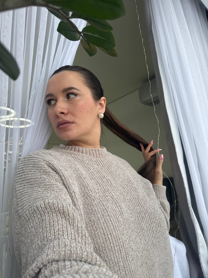 The image shows an adult female subject positioned indoors, located in Odintsovo, Russia. She has dark brown hair pulled back into a ponytail and a light complexion with visible freckles on her face.…read more