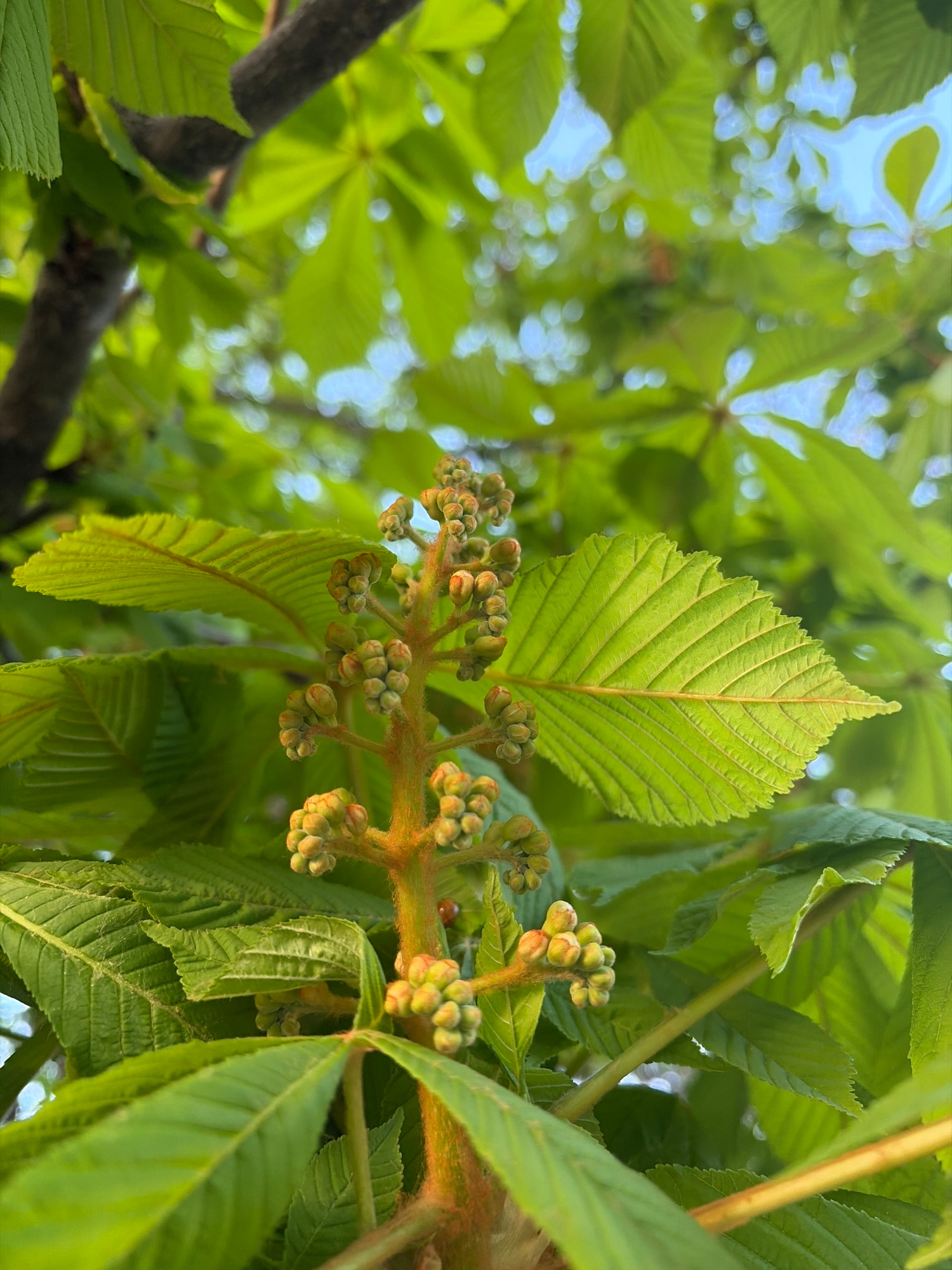 The image shows a close-up of a tree, specifically a horse chestnut tree. The view is from below, looking up into the foliage. A prominent, light-green compound leaf with serrated edges is centrally p…read more