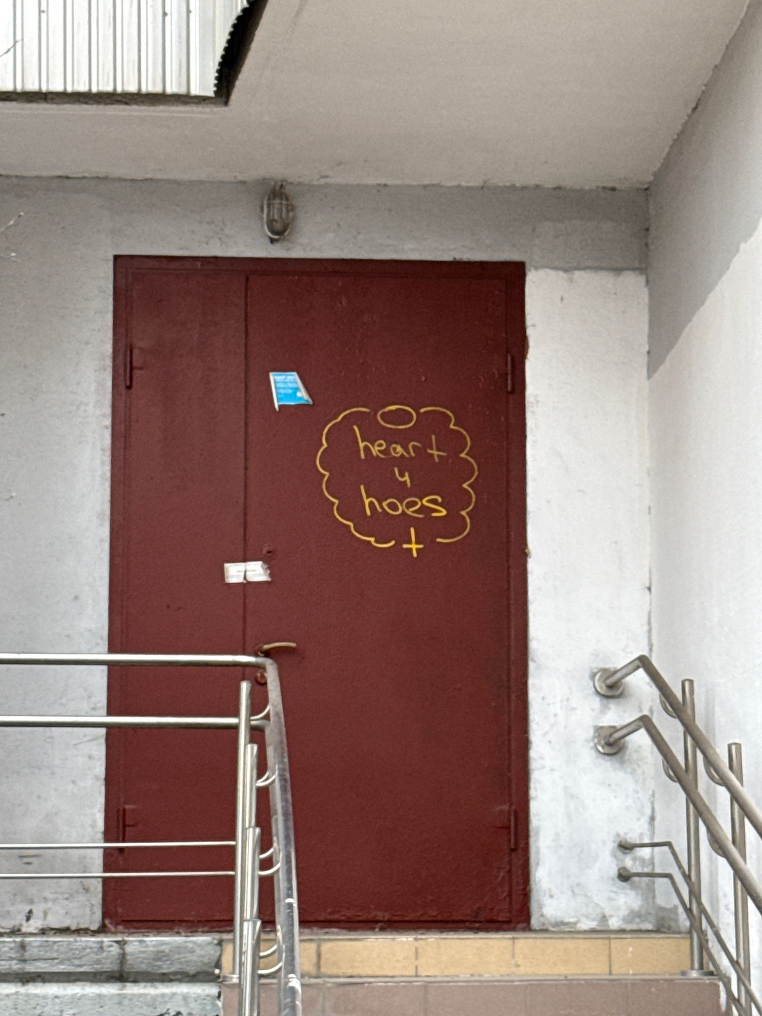The image depicts a stairwell in Moscow, Russia. The walls are painted in light gray and white. A large, maroon-colored metal door occupies a central position in the frame, with graffiti written in ye…read more