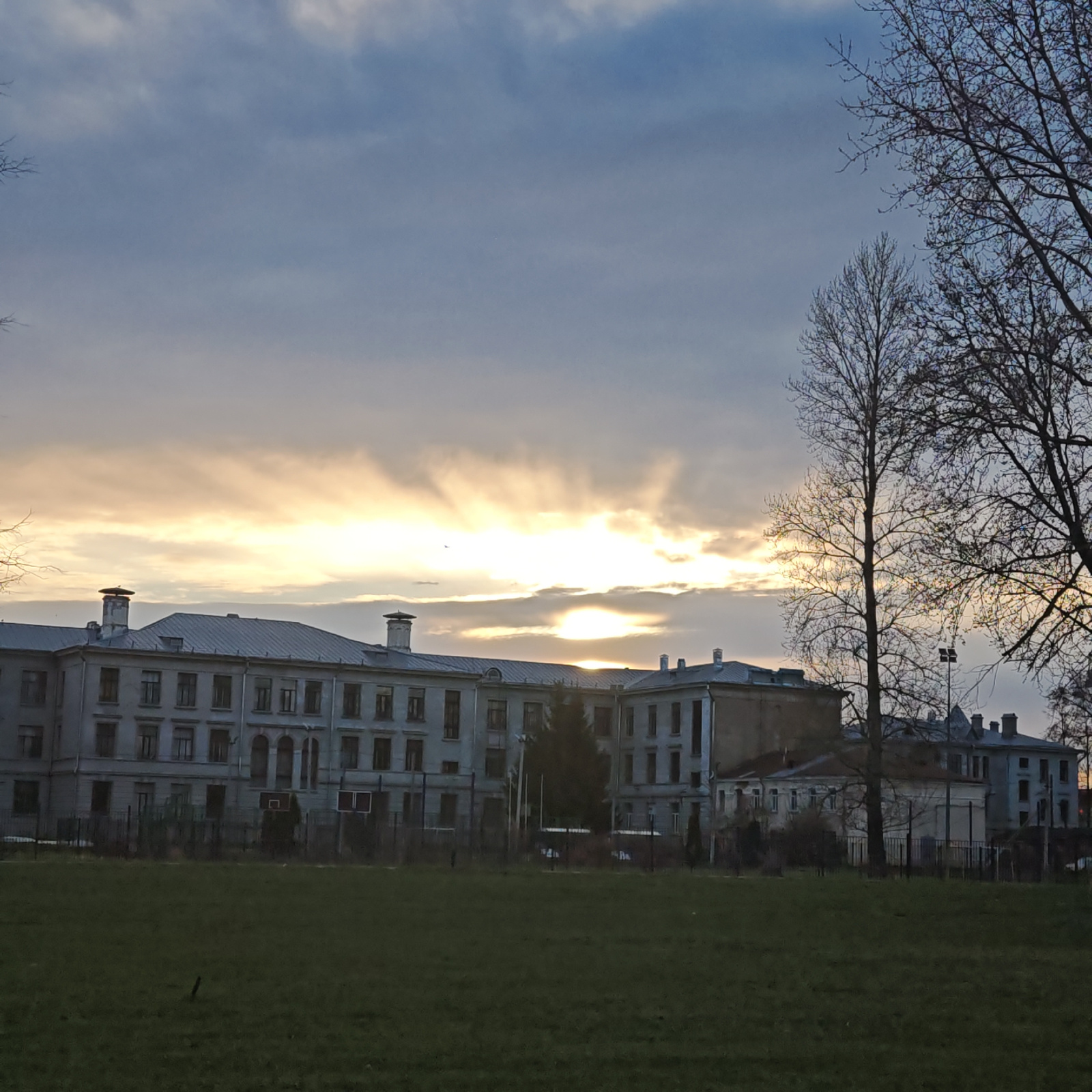 The image depicts a large, grey, multi-story building with a flat roof and multiple windows, situated behind a green lawn. The building appears to have architectural features such as chimneys and a section of the roof is slightly elevated. A fence runs along the edge of the lawn, separating it from the building. Bare trees are visible on the right side of the frame. The sky is overcast with a bright, yellow-orange glow around the horizon line, suggesting either sunrise or sunset. There are no people visible in the image. The location is Unknown, Unknown. | Open Wire