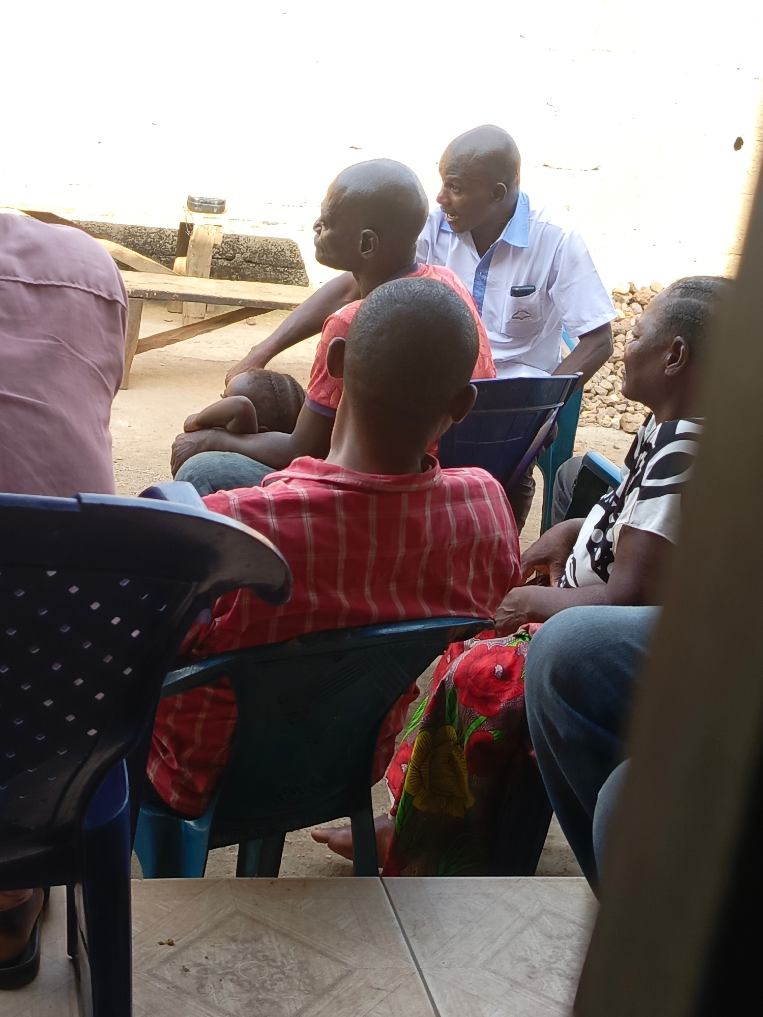 Several people are gathered outside in Akwanga, Nigeria. One man in a white shirt and blue trim appears to be speaking to another man with a bald head. A child with braided hair rests on the lap of onβ¦read more
