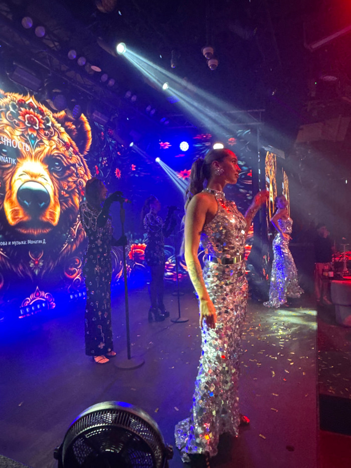 The image depicts an indoor performance scene within a high-end entertainment venue in Dubai, United Arab Emirates, likely a nightclub or concert hall. Four female subjects are visible on a stage unde…read more