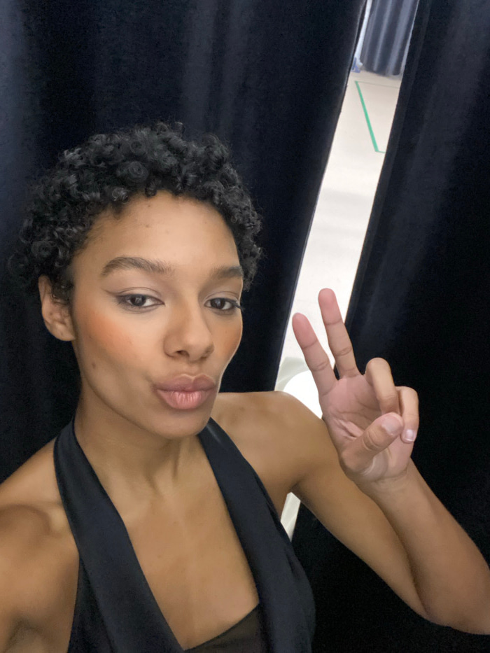 A young adult female is depicted in a front-facing selfie, positioned between two dark, heavy fabric curtains in an indoor setting in Pantin, France. She has short, curly dark hair, and her face featu…read more