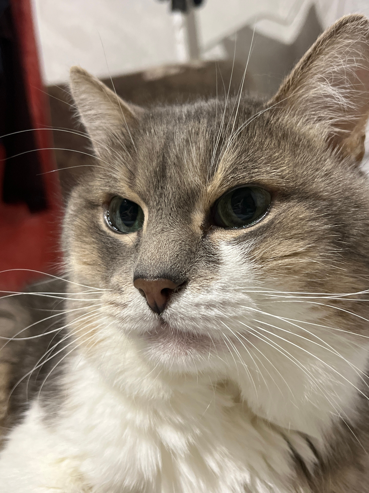 A close-up shot of a cat's face with white and gray fur. The cat has green eyes, a pink nose, and long white whiskers. The background is out of focus, but there are hints of white and red objects. Theβ¦read more
