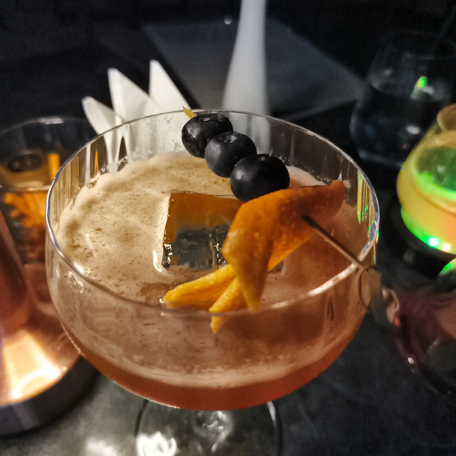 This media file captures a close-up shot of a cocktail in a coupe glass, set in a dimly lit bar or restaurant environment. The cocktail features a frothy head, a reddish-brown liquid, and a large, squ…read more
