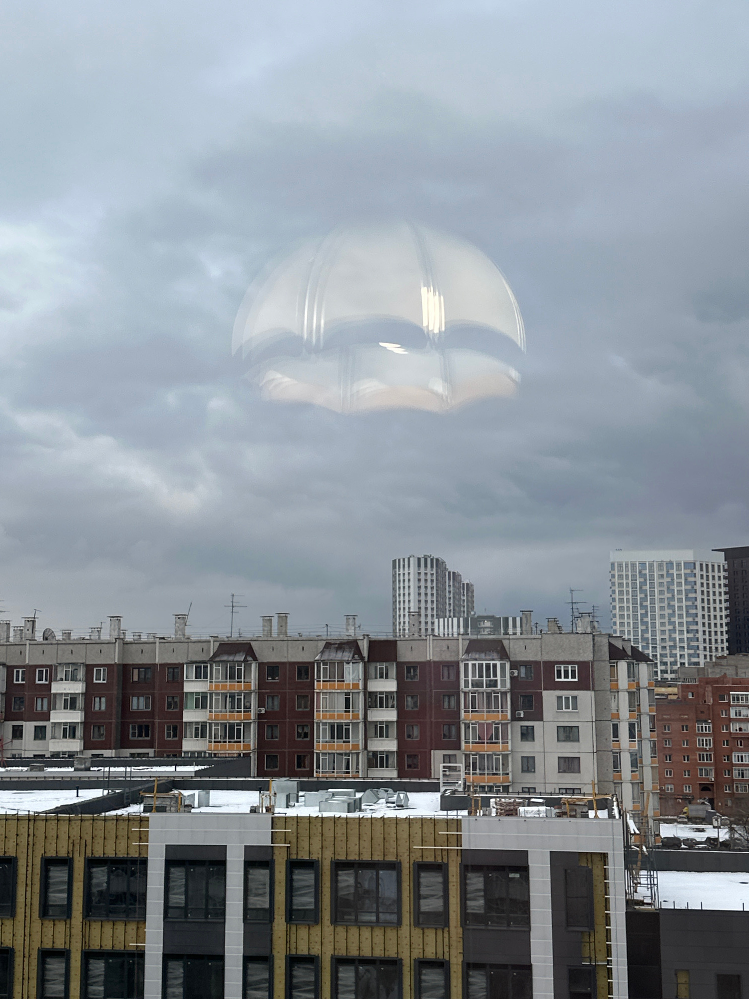 This image presents an urban cityscape in Krasnoyarsk, Russia, viewed from a window, as indicated by a prominent, blurred, light-colored reflection in the sky area, likely an interior light fixture. T…read more