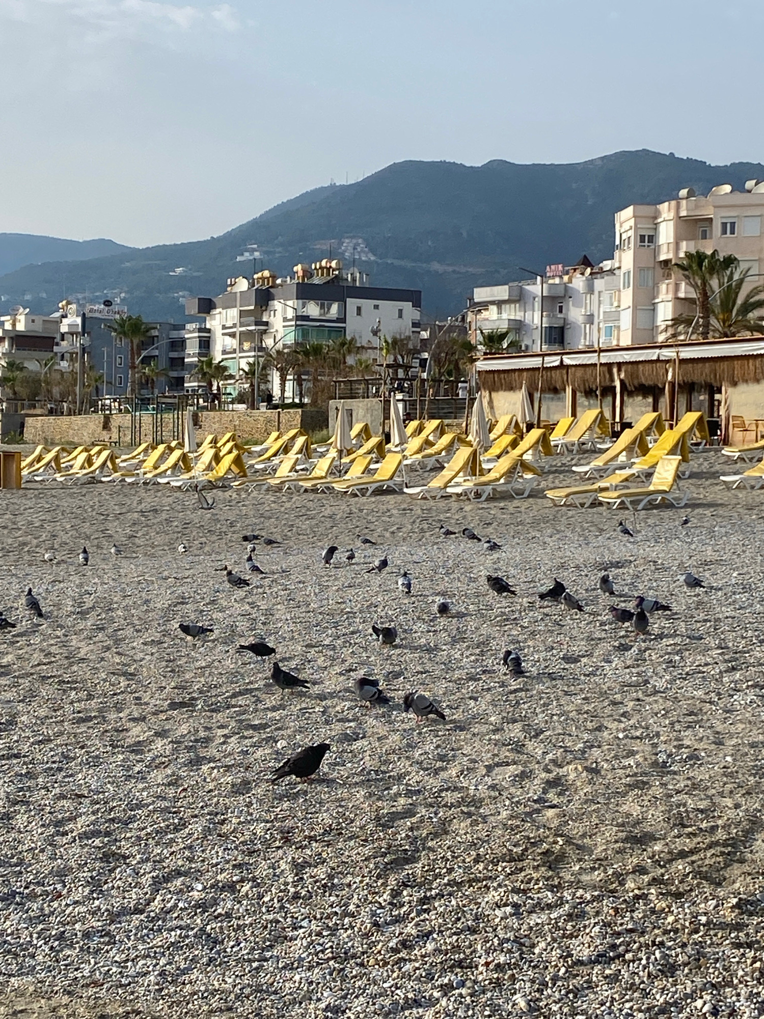 The scene is a beach in Alanya, Turkey, densely populated with pigeons. Rows of unoccupied yellow beach chairs line the beach near a series of buildings along the shore. A large mountain rises promine…read more