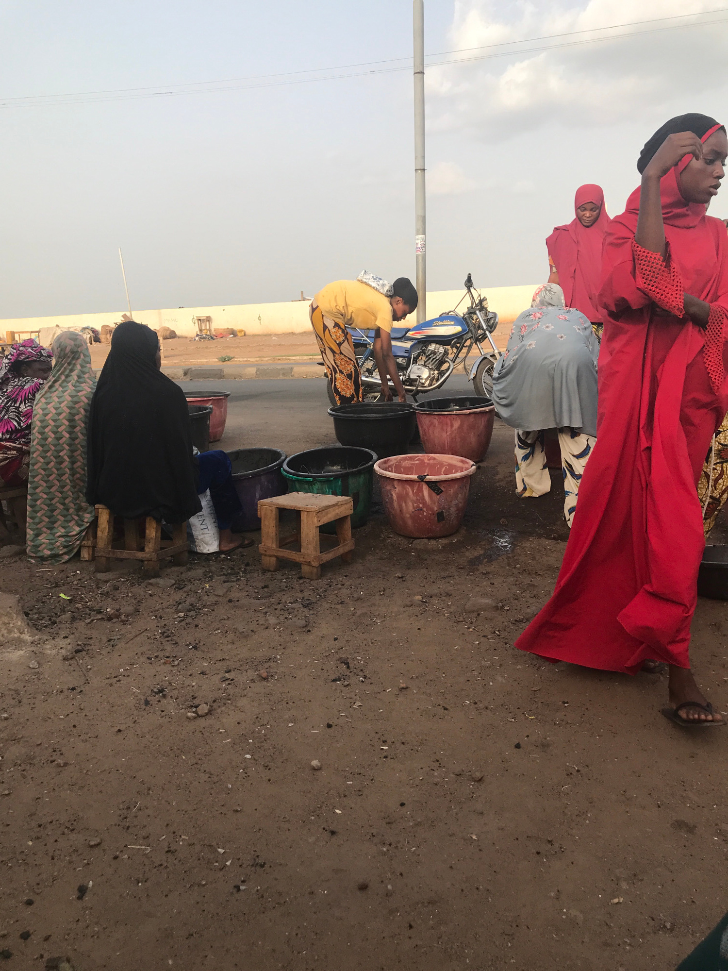 In Lokoja, Nigeria, a street scene unfolds with people gathered along a roadside. Several women in traditional dress, including red robes and hijabs, are standing or sitting on small wooden stools. A…read more