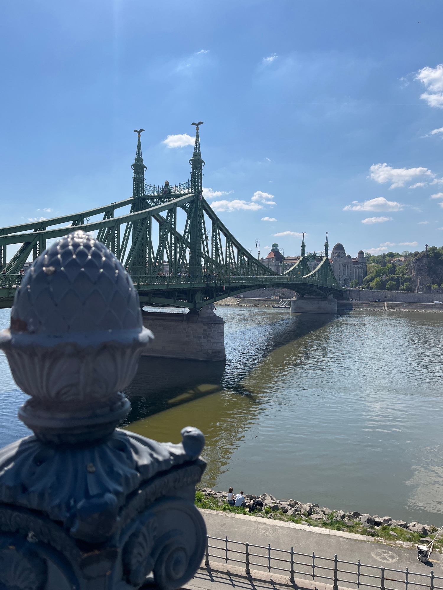This is an outdoor shot of the Liberty Bridge in Budapest, Hungary. The steel bridge crosses the Danube River, with a view of Gellert Hill in the background. The weather is sunny with scattered clouds…read more
