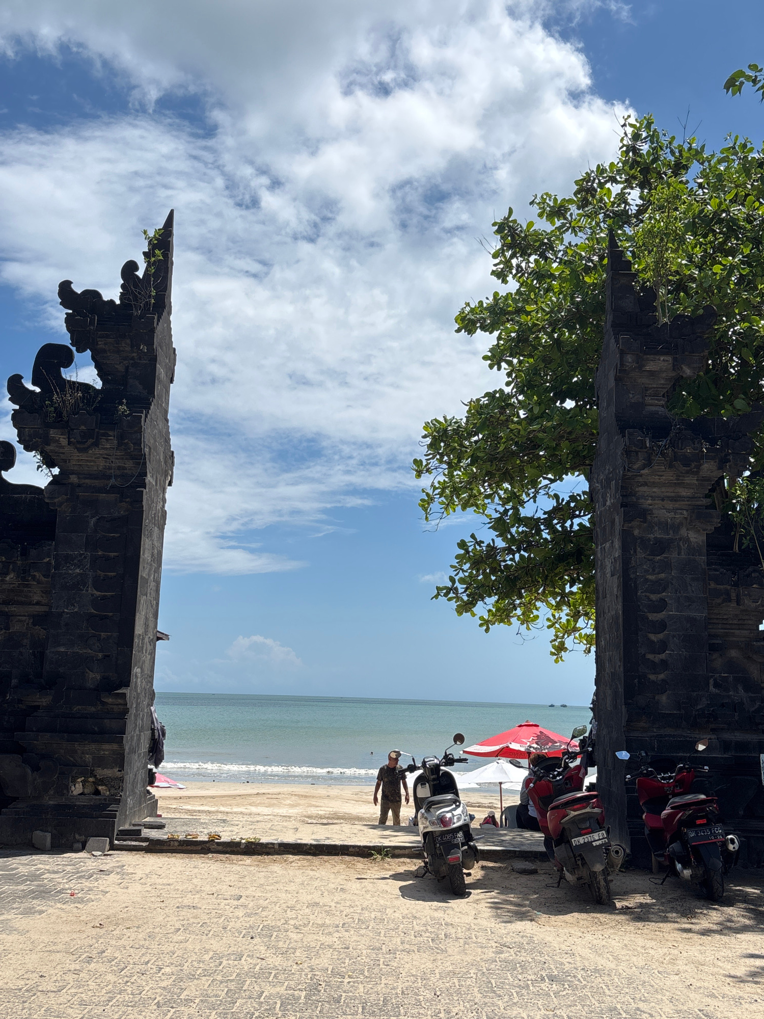 The scene is a view of a beach in Kuta Selatan, Indonesia, framed by two parts of a dark stone structure, possibly a gate or the remains of a building. The structure is detailed with traditional carvi…read more
