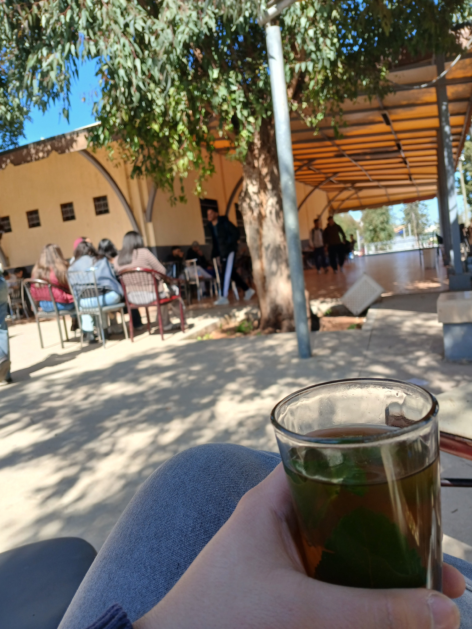 A first-person perspective photograph shows a hand holding a clear glass of what appears to be tea with mint leaves inside. The background reveals a public space, possibly a cafe or outdoor seating ar…read more