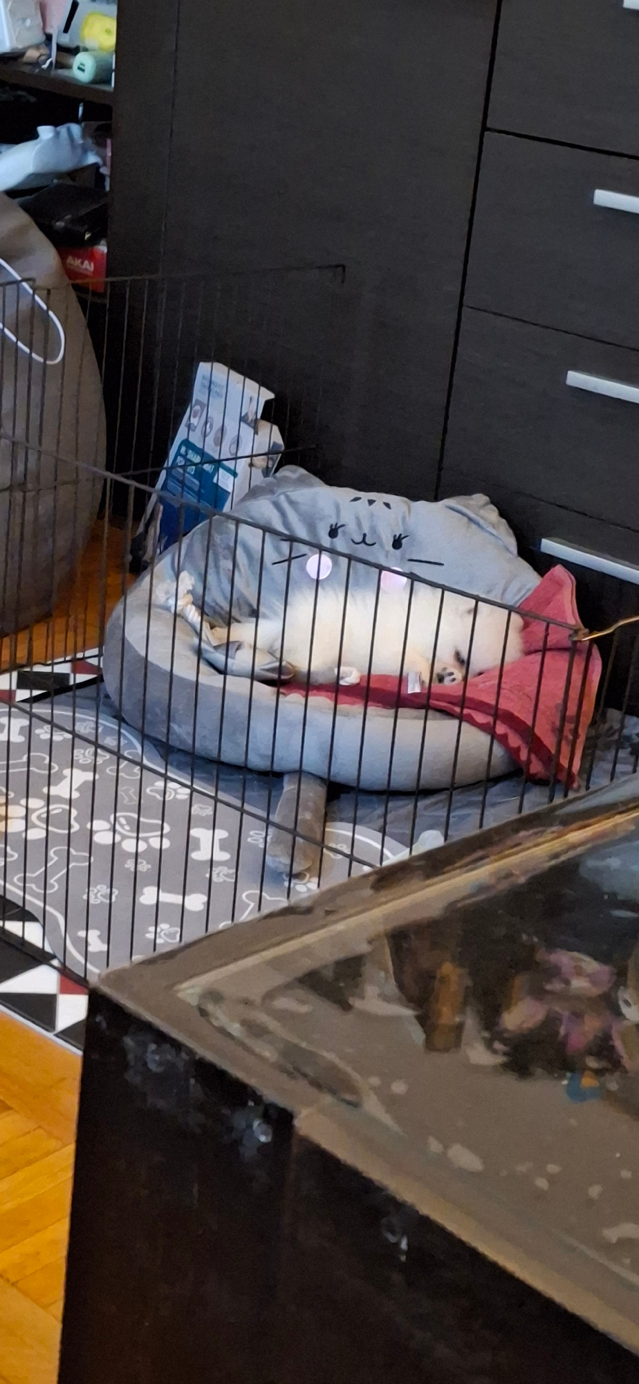 A white, small dog rests in a cage. The dog is lying on a light blue pillow with a cat face design and a red blanket. The cage contains a bed with a gray and white bone and paw print pattern. In the b…read more