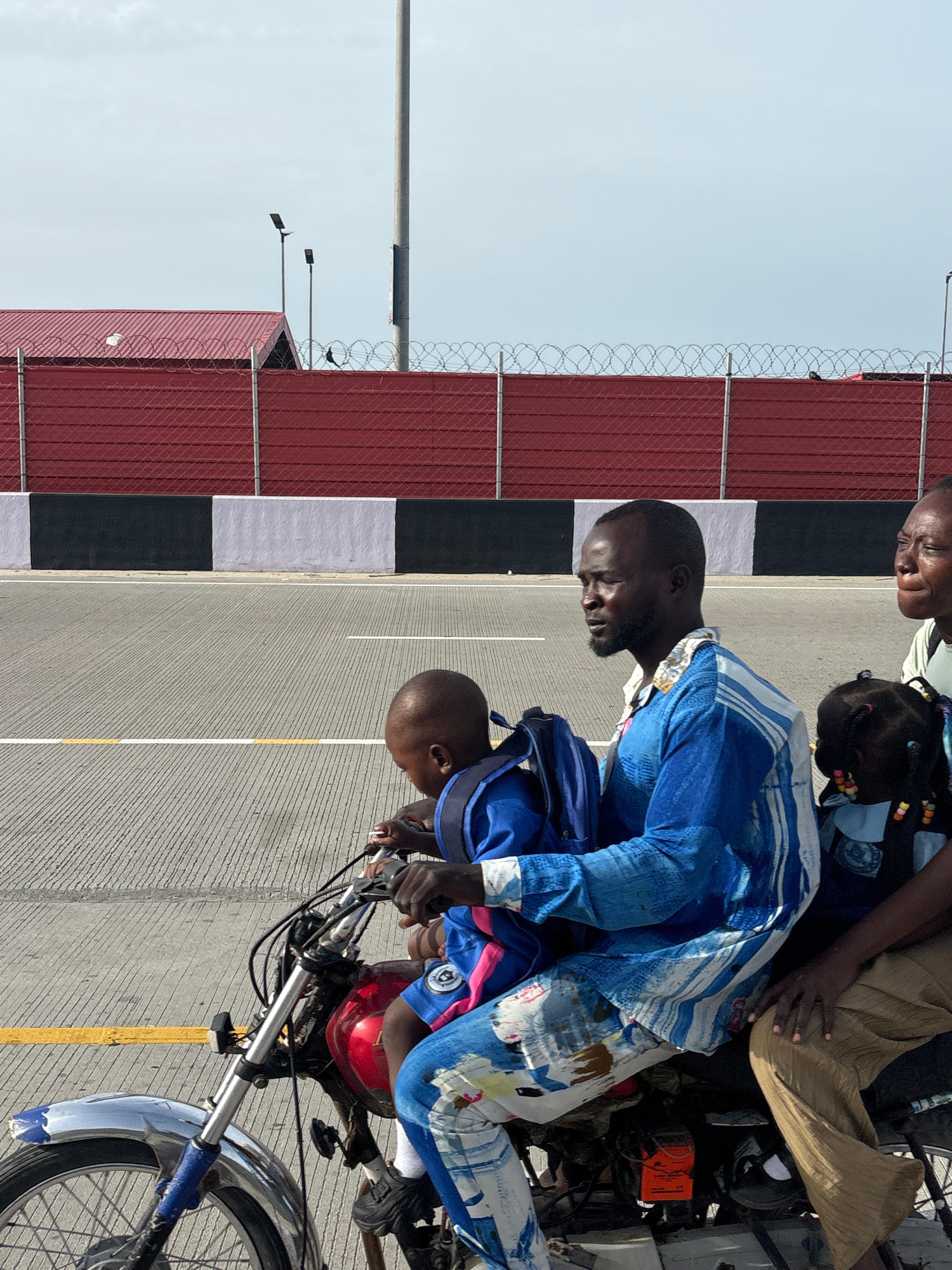 In Alaguntan, Nigeria, a group of people are riding a motorcycle on a paved road marked with yellow lines. The driver is a dark-skinned man wearing a blue patterned shirt. A child in a blue shirt is dā¦read more