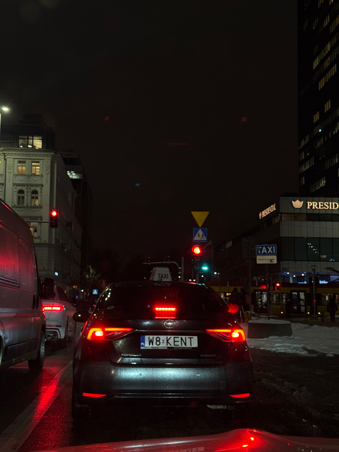 A nighttime scene depicts a busy intersection in Warsaw, Poland, specifically in the vicinity of the West Station Office Center at Aleje Jerozolimskie 123A. The viewpoint is from inside a vehicle, ind…read more