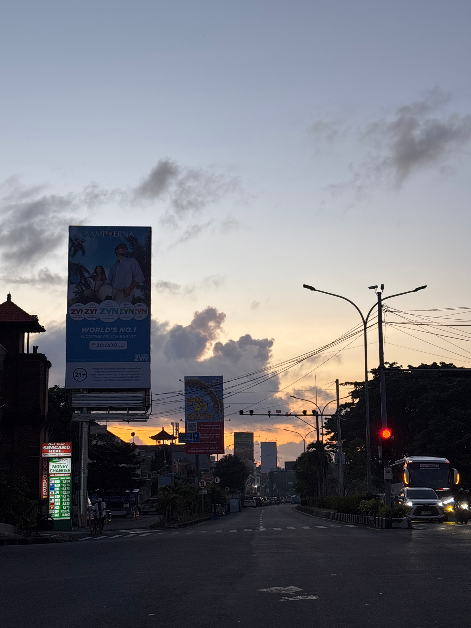 The image captures a street scene at dusk in Kuta, Indonesia. A two-lane road stretches into the distance, flanked by buildings and trees. On the right side of the road, a bus and a white car are visiβ¦read more