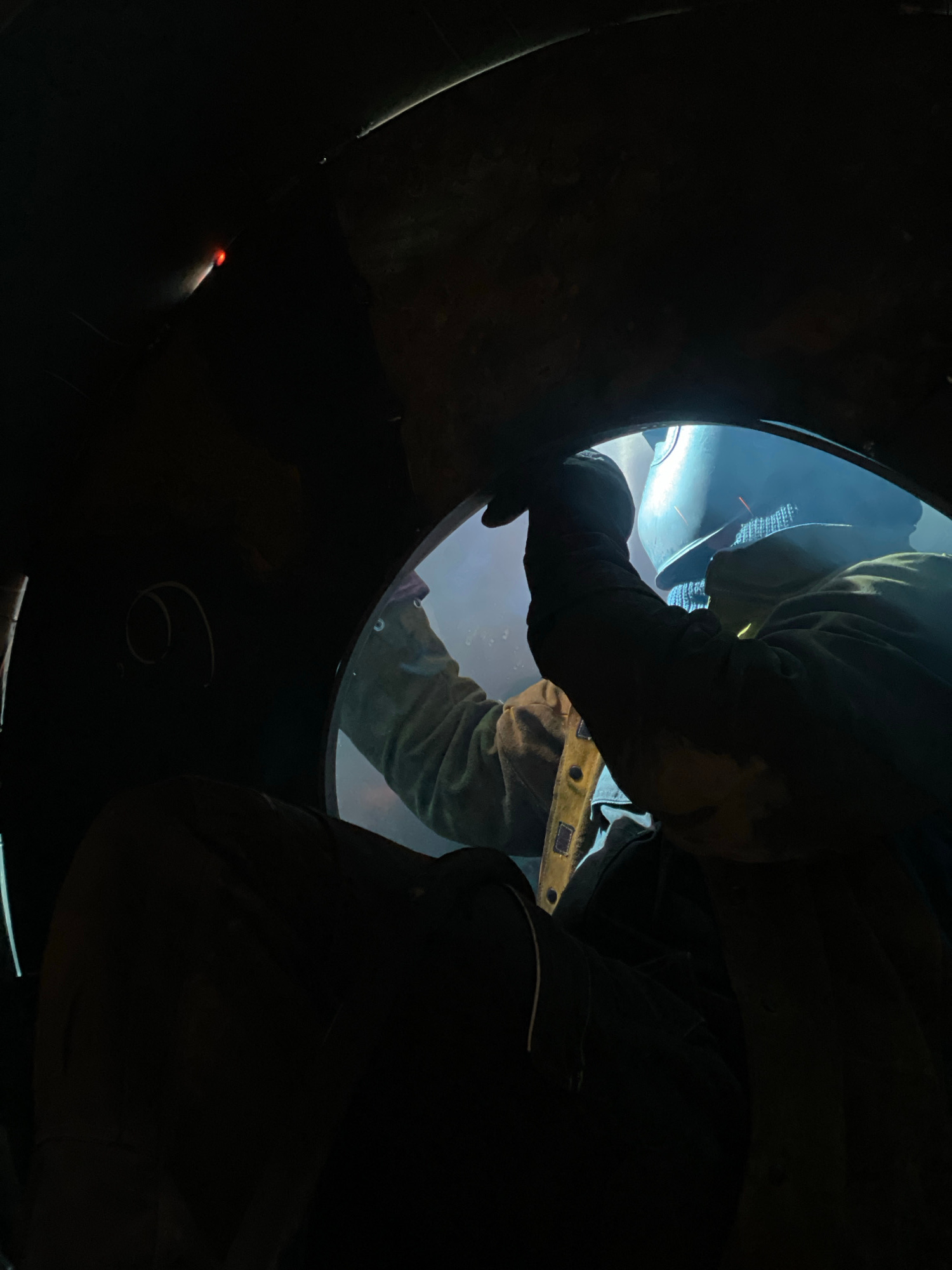 A welder works inside a dark, cylindrical structure. The welder wears protective gear, including gloves and a mask, and is positioned near the opening of the structure. Welding sparks illuminate the a…read more