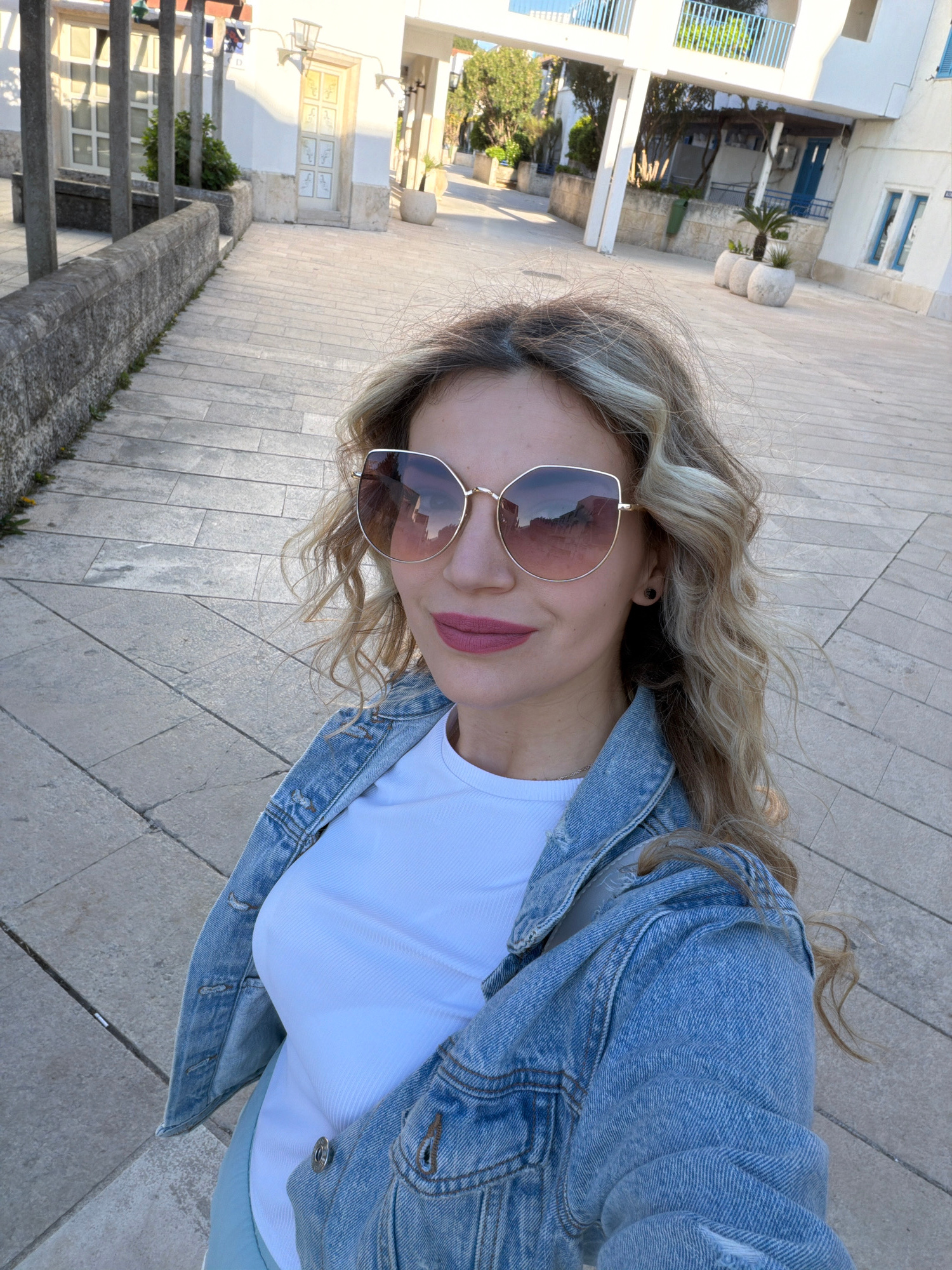 A woman is taking a selfie outside, likely in Budva, Montenegro, given the architectural style. She is wearing sunglasses, a white shirt, and a denim jacket. The background shows a pedestrian area wit…read more