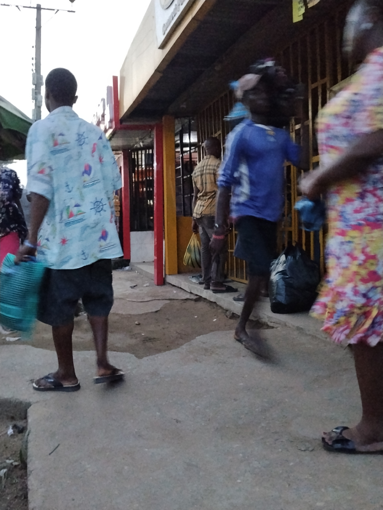 The image depicts a street scene in Umuode, Nigeria, during daylight. The foreground features three individuals: one facing away, wearing a light blue patterned shirt, dark shorts, and sandals, carryi…read more